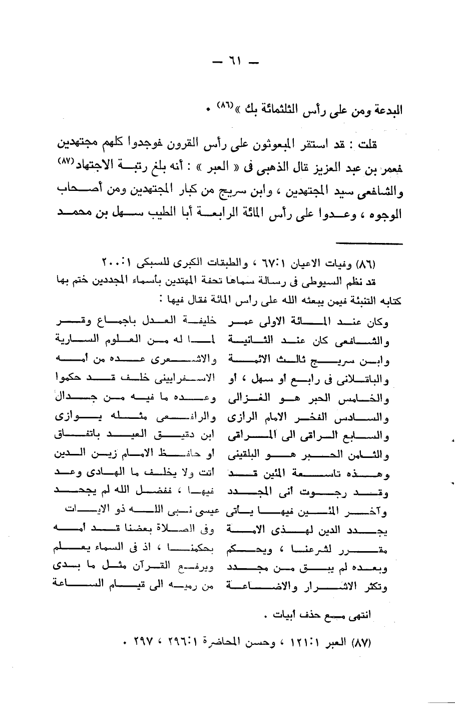 قلت قد اسْتَقر المبعوثون على رَأس الْقُرُون فوجدوا كلهم مجتهدون فعمر بن عبد الْعَزِيز قَالَ الذَّهَبِيّ فِي العبر أَنه بلغ رُتْبَة الِاجْتِهَاد وَالشَّافِعِيّ سيد الْمُجْتَهدين وَابْن سُرَيج من كبار الْمُجْتَهدين وَمن أَصْحَاب الْوُجُوه وعدوا على رَأس الْمِائَة الرَّابِعَة أَبَا الطّيب سهل بن مُحَمَّد