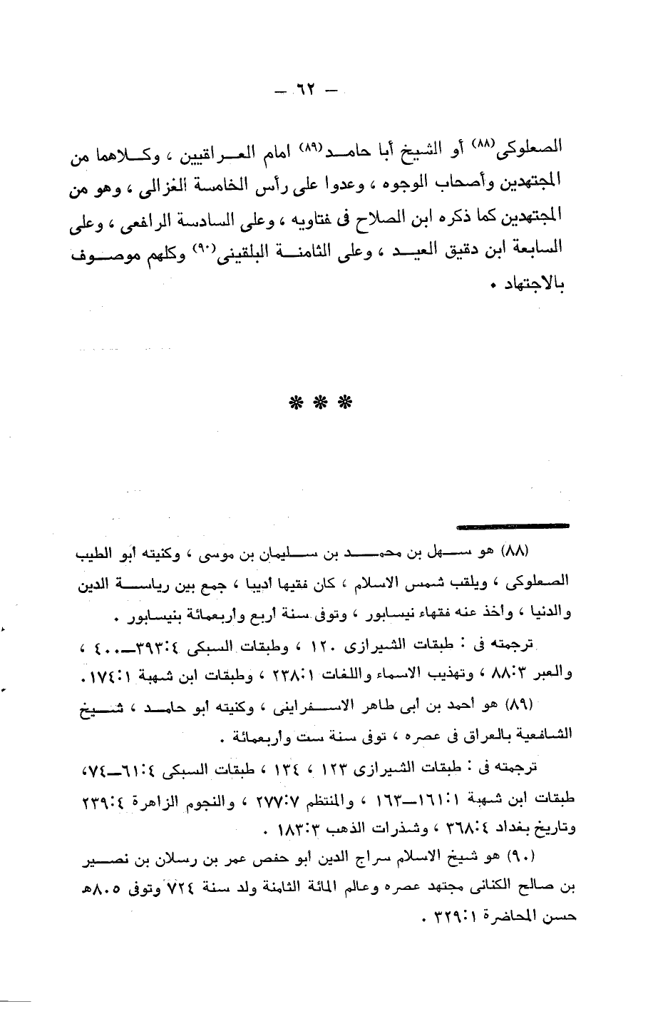 الصعلوكي أَو الشَّيْخ أَبَا حَامِد إِمَام الْعِرَاقِيّين وَكِلَاهُمَا من الْمُجْتَهدين وَأَصْحَاب الْوُجُوه وعدوا على رَأس الْخَامِسَة الْغَزالِيّ وَهُوَ من الْمُجْتَهدين كَمَا ذكره ابْن الصّلاح فِي فَتَاوِيهِ وعَلى السَّادِسَة الرَّافِعِيّ وعَلى السَّابِعَة ابْن دَقِيق الْعِيد وعَلى الثَّامِنَة البلفيني وَكلهمْ مَوْصُوف بِالِاجْتِهَادِ