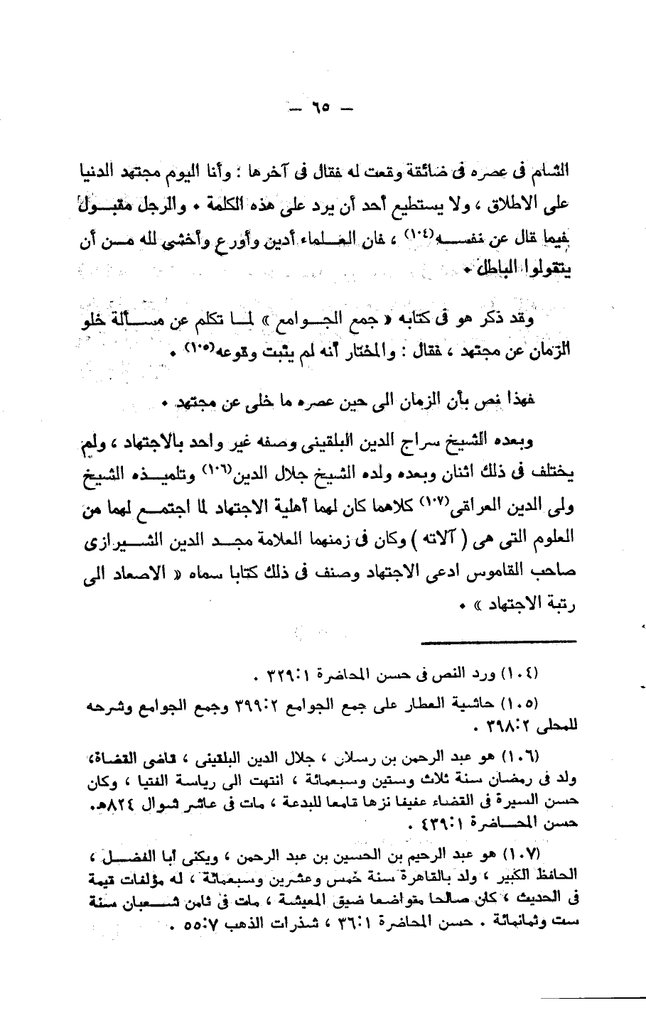 وَبعده الشَّيْخ سراج الدّين البُلْقِينِيّ وَصفه غير وَاحِد بِالِاجْتِهَادِ وَلم يخْتَلف فِي ذَلِك اثْنَان وَبعده وَلَده الشَّيْخ جلال الدّين وتلميذه الشَّيْخ ولي الدّين الْعِرَاقِيّ كِلَاهُمَا كَانَ لَهما أَهْلِيَّة الِاجْتِهَاد لما اجْتمع لَهما من الْعُلُوم الَّتِي هِيَ آلاته وَكَانَ فِي زمنهما الْعَلامَة مجد الدّين الشِّيرَازِيّ صَاحب الْقَامُوس أَدعِي الِاجْتِهَاد وصنف فِي ذَلِك كتابا سَمَّاهُ الأصعاد إِلَى رُتْبَة الِاجْتِهَاد