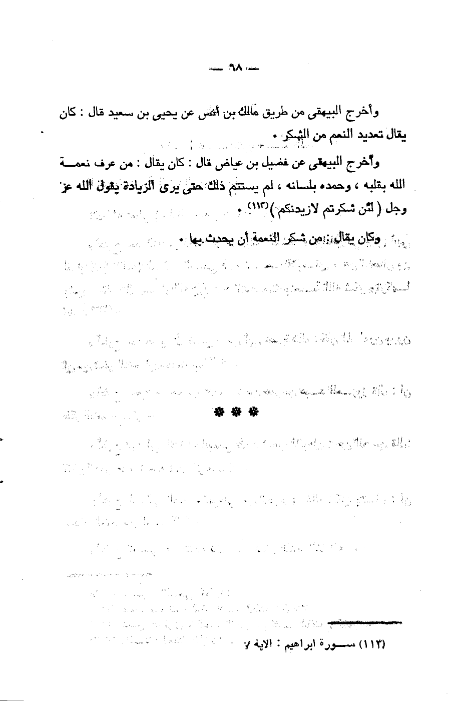 وَأخرج الْبَيْهَقِيّ عَن فُضَيْل بن عِيَاض قَالَ كَانَ يُقَال من عرف نعْمَة الله بِقَلْبِه وحمده بِلِسَانِهِ لم يستتم ذَلِك حَتَّى يري الزِّيَادَة يَقُول الله عز وَجل {لَئِن شكرتم لأزيدنكم}