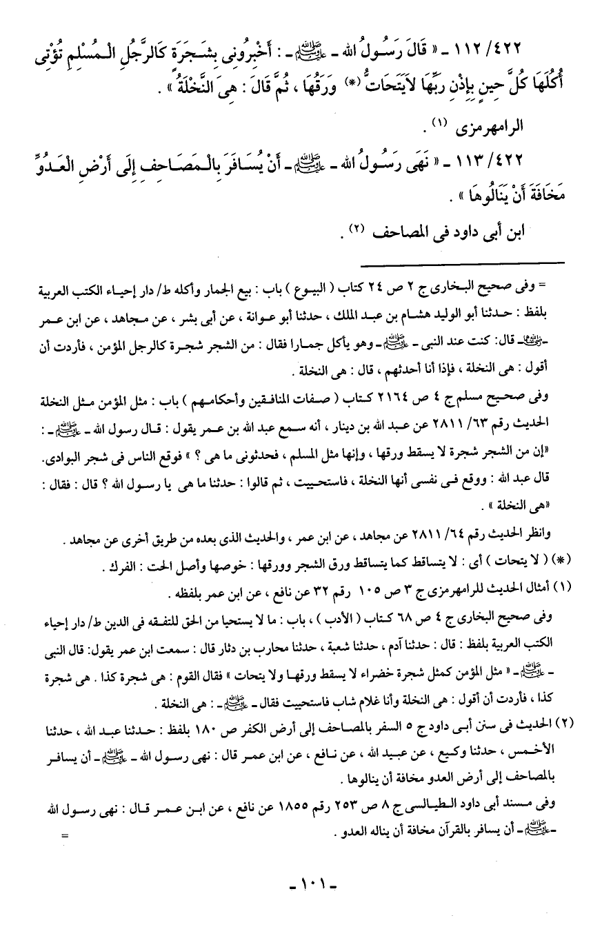 422/ 113 - "نَهَى رَسُولُ الله - صلى الله عليه وسلم - أَنْ يُسَافَرَ بالْمَصَاحف إِلَى أَرْضِ الْعَدُوِّ مَخَافَةَ أَنْ يَنَالُوهَا".