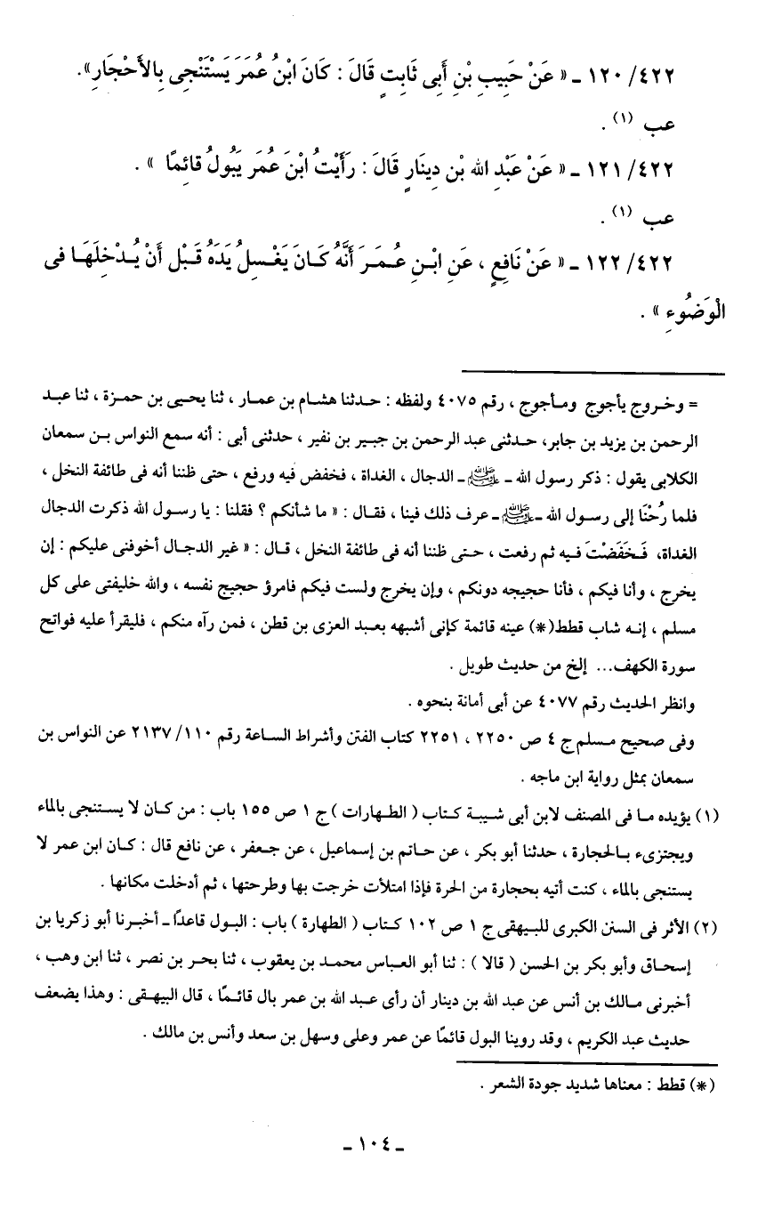 422/ 121 - "عَنْ عَبْدِ الله بْن دِينَارٍ قَالَ: رَأَيْتُ ابْنَ عُمَر يَبُولُ قائِمًا".