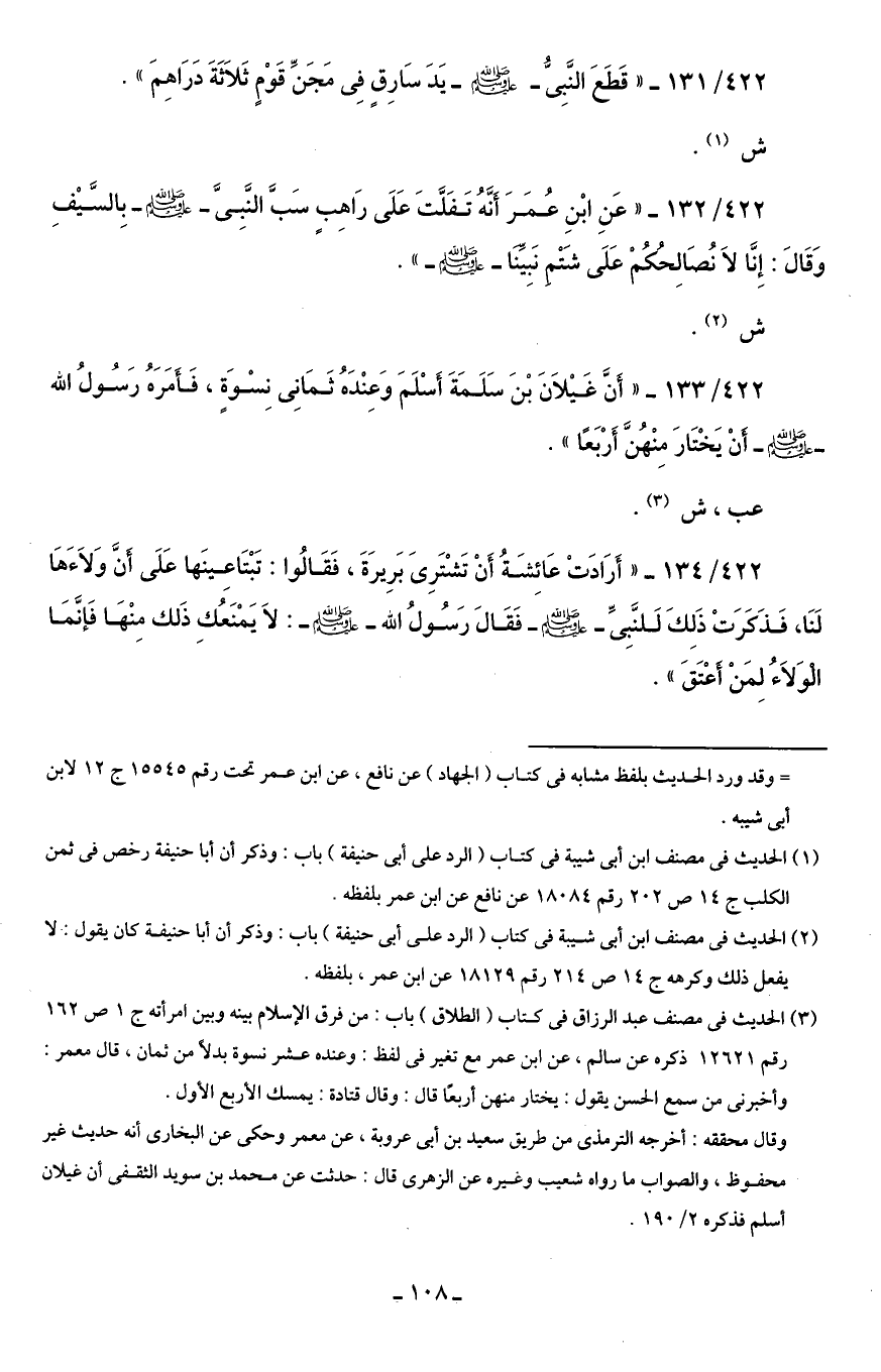 422/ 133 - "أَنَّ غَيْلاَنَ بْنَ سَلَمَةَ أَسْلَمَ وَعِنْدَهُ ثَمَانِى نِسْوَةٍ، فَأَمَرَهُ رَسُولُ الله - صلى الله عليه وسلم - أَنْ يَخْتَارَ مِنْهُنَّ أَرْبَعًا".