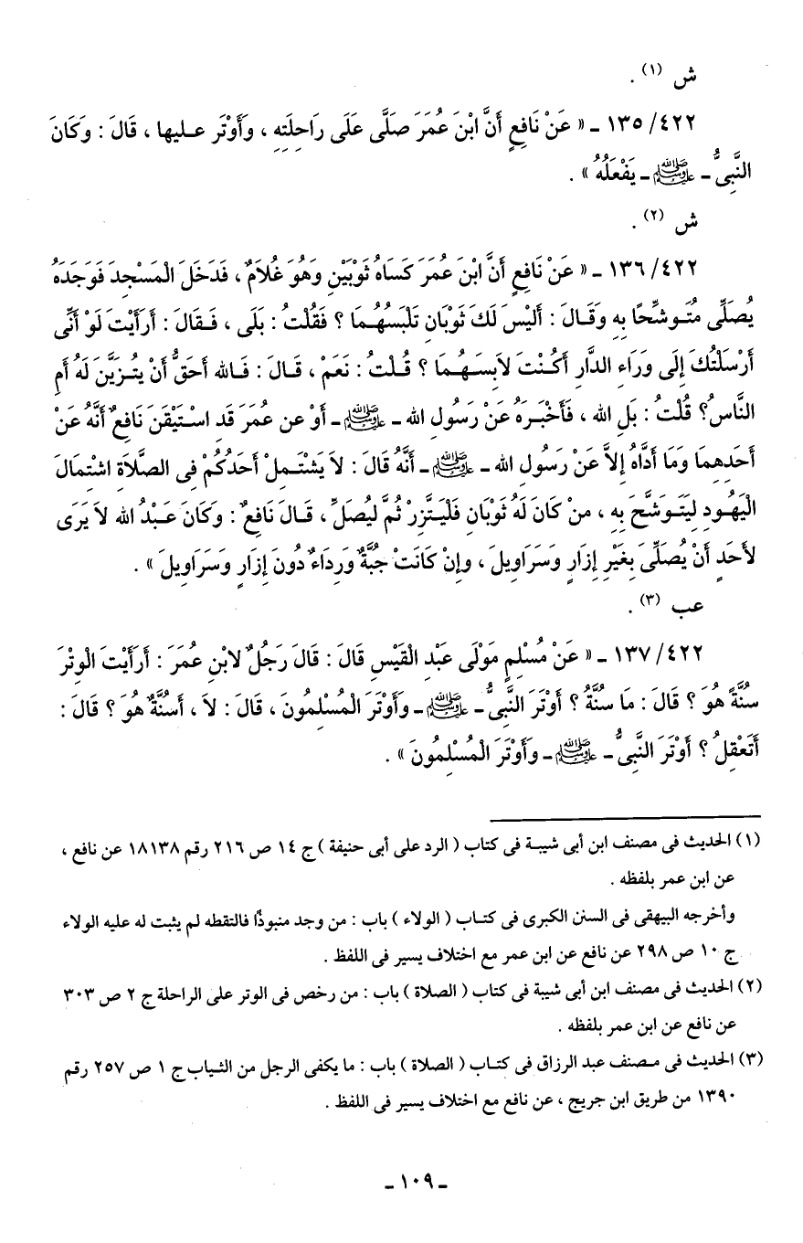 422/ 135 - " عَنْ نَافِعٍ أَنَّ ابْنَ عُمَرَ صَلَّى عَلَى رَاحِلَتِهِ، وَأَوْتَر عليها، قَالَ: وَكانَ النَّبِىُّ - صلى الله عليه وسلم - يَفْعَلُهُ ".