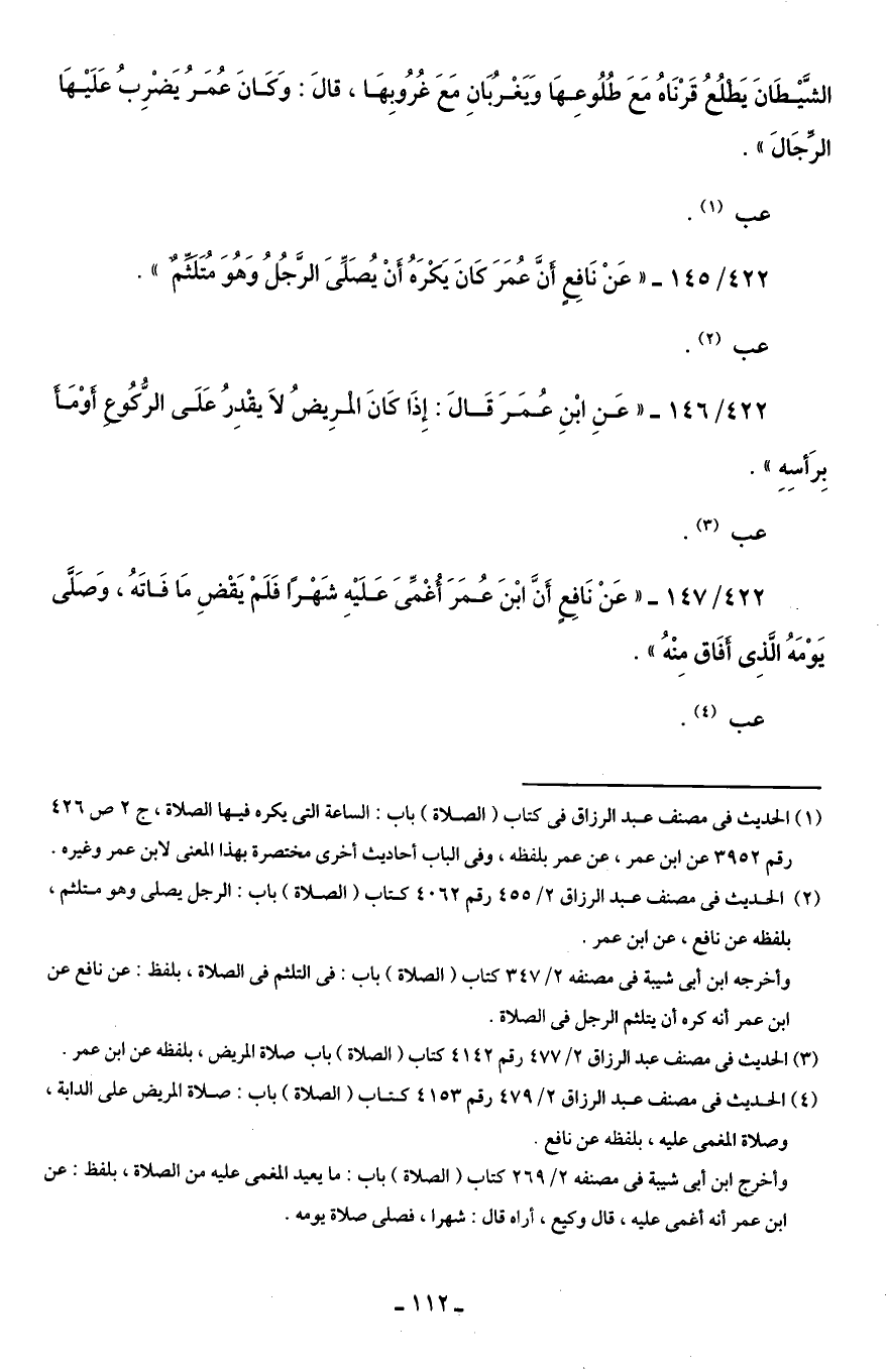 (¬1) الحديث في مصنف عبد الرزاق في كتاب (الصلاة) باب: الساعة التى يكره فيها الصلاة، ج 2 ص 426 رقم 3952 عن ابن عمر، عن عمر بلفظه، وفى الباب أحاديث أخرى مختصرة بهذا المعنى لابن عمر وغيره.