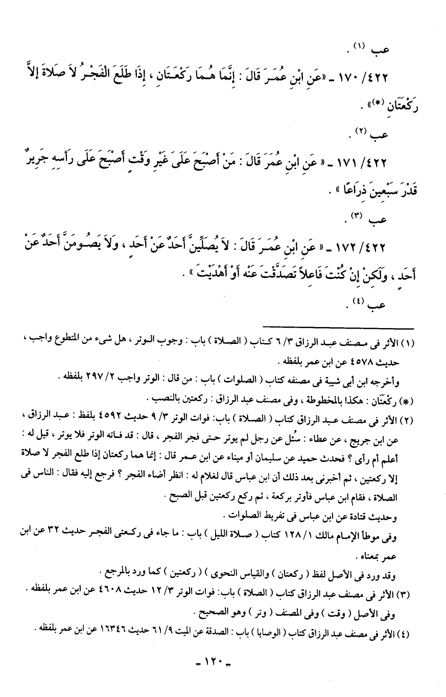 422/ 170 - "عَنِ ابْنِ عُمَرَ قَالَ: إِنَّمَا هُمَا رَكْعَتَانِ، إِذَا طَلَعَ الْفَجْرُ لاَ صَلاةَ إلَّا رَكْعَتَانِ (*) ".