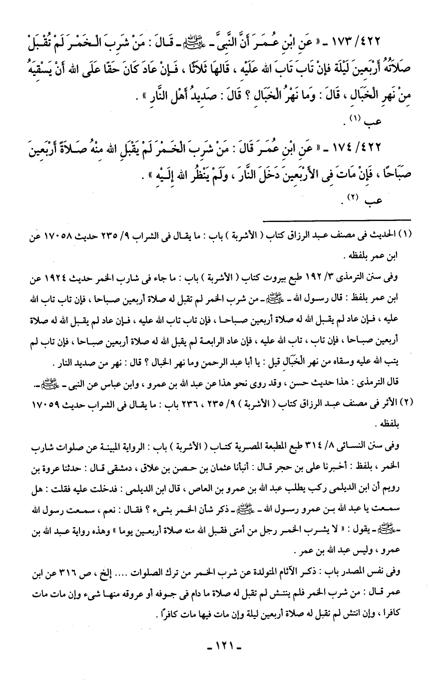 422/ 173 - "عَنِ ابْنِ عُمَرَ أَنَّ النَّبِىَّ - صلى الله عليه وسلم - قَالَ: مَنْ شَرِبَ الْخَمْرَ لَمْ تُقْبَلْ صَلاُتهُ أَرْبَعينَ لَيْلَة فإنْ تَابَ تَابَ الله عَلَيْهِ، قَالهَا ثَلاثًا، فَإنْ عَادَ كَانَ حَقّا عَلَى الله أنْ يَسْقِيَهُ مِنْ نَهرِ الْخَبَالِ، قَالَ: وَما نَهْرُ الْخَبَالِ؟ قَالَ: صَدِيدُ أَهْل النَّارِ".