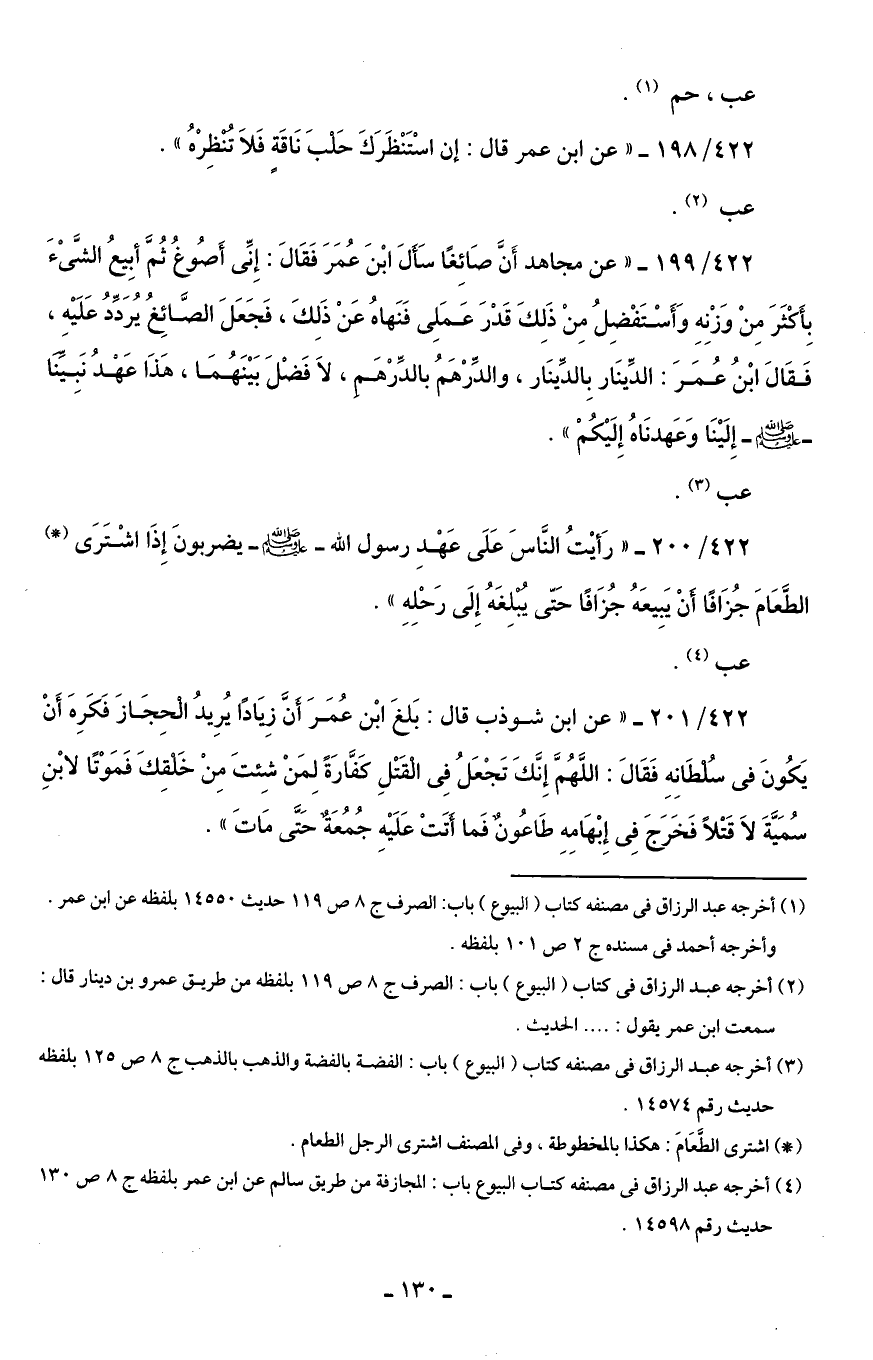 422/ 199 - " عن مجاهد أَنَّ صَائِغًا سَأَلَ ابْنَ عُمَرَ فَقَالَ: إِنِّى أَصُوغُ ثُمَّ أبِيعُ الشَّىْءَ بِأَكثَرَ مِن وَزْنِهِ وَأَسْتَفْضِلُ مِنْ ذَلِكَ قَدْرَ عَمَلِى فَنَهاهُ عَنْ ذَلِكَ، فَجَعَلَ الصَّائِغُ يُرَدِّدُ عَلَيْهِ، فَقَالَ ابْنُ عُمَرَ: الدِّينَار بِالدِّينَار، والدِّرْهَمُ بالدِّرْهَم، لاَ فَضْلَ بَيْنَهُمَا، هَذَا عَهْدُ نَبِيِّنَا - صلى الله عليه وسلم - إِلَيْنَا وَعَهدنَاهُ إِلَيْكُمْ ".