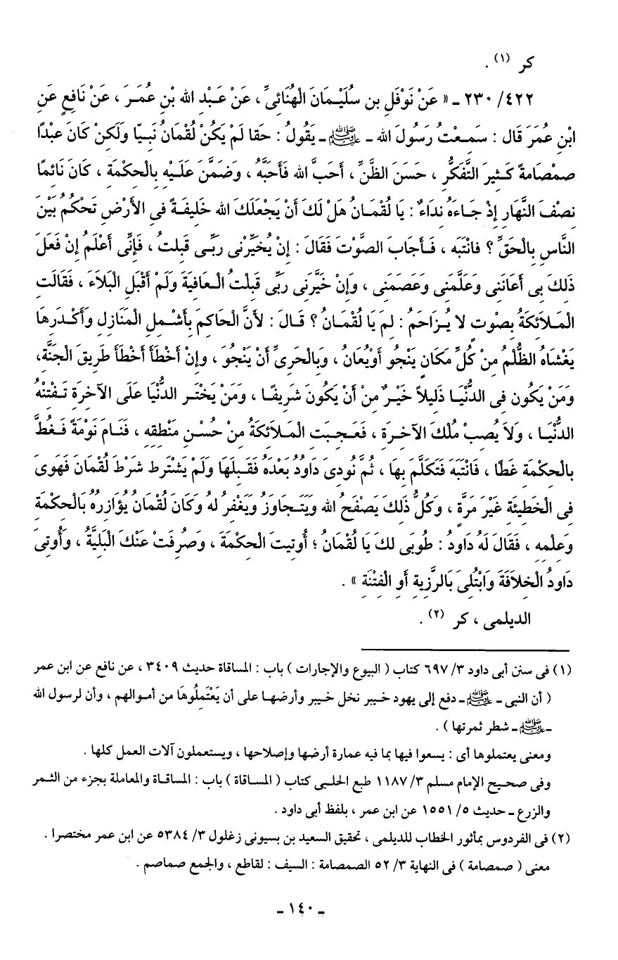 422/ 230 - " عَنْ نَوْفَلِ بن سُلَيْمَانَ الْهُنَائِىِّ، عَنْ عَبْدِ الله بْنِ عُمَرَ، عَنْ نَافِعٍ عَنِ ابْنِ عُمَرَ قَال: سَمعْتُ رَسُولَ الله - صلى الله عليه وسلم - يَقُولُ: حَقا لَمْ يَكُنْ لُقْمَانُ نَبيّا وَلَكِنْ كَانَ عبْدًا صمْصَامةً كَثِيرَ التَّفَكُّرِ، حَسَنَ الظَّنِّ، أَحَبَّ الله فَأَحَبَّهُ، وَضَمَّنَ عَلَيْهِ بِاَلْحكْمَةِ، كَانَ نَائِمًا نِصْفَ النَّهَارِ إِذ جَاءَهُ نِدَاءٌ: يَا لُقْمَانُ هَلْ لَكَ أَنْ يَجْعَلَكَ الله خَلِيفَةً في الأَرْضِ تَحْكُمُ بَيْنَ النَّاسِ بِالْحَقِّ؛ فانْتَبَه، فَأجَابَ الصَّوْتَ فَقَالَ: إِنْ يُخيِّرْنى ربِّى قَبِلتُ، فَإِنِّى أَعْلَمُ إِنْ فَعَلَ ذَلكَ بِى أَعَانَنِى وَعَلَّمَنِى وَعَصَمَنِى، وَإِنْ خَيَّرَنِى ربِّى قَبلتُ الْعَافِيَةَ وَلَمْ أَقْبَلِ الْبَلاَءَ، فَقَالَتِ الْمَلاَئكَةُ بصوْتٍ لا يُزَاحَمُ: لِمَ يَا لُقْمَانُ؟ قَالَ: لأَنَّ الْحَاكِمَ بِأَشْمِلِ الْمَنَازِلِ وَأَكْدَرِهَا يَغْشَاهُ الظُّلْمُ مِنْ كُلِّ مَكَانٍ يَنْجُو أَوْ يُعَانُ، وَبِالْحَرِيِّ أنْ يَنْجُوَ، وإِنْ أَخْطَأ أخْطَأَ طَرِيقَ الْجَنَّةِ، وَمَنْ يَكُون فِى الدُّنْيَا ذَليلًا خَيْرٌ مِنْ أَنْ يَكُونَ شَرِيفًا، وَمَنْ يَخْتَر الدُّنْيَا عَلَى الآخِرَةِ تَفْتِنْهُ الدُّنْيَا، وَلاَ يُصبْ مُلْكَ الآخِرَةِ، فَعَجِبَتِ الْمَلاَئِكَةُ مِنْ حُسْنِ مَنْطِقِهِ، فَنَامَ نَوْمَةً فَغُطَّ بالْحِكْمَة غَطًا، فَانْتَبَهَ فَتَكَلَّمَ بِهَا، ثُمَّ نُودِىَ دَاوُدُ بَعْدَهُ فَقَبِلَهَا وَلَمْ يَشْتَرط شَرْطَ لُقْمَانَ فَهَوىَ فِى الْخَطَيئَةِ غَيْرَ مَرَّةٍ، وَكُلُّ ذَلِكَ يَصْفَحُ الله وَيَتَجَاوَزُ وَيَغْفِرُ لهُ وَكَانَ لُقْمَانُ يُؤَازِرُهُ بَالْحِكْمَةِ وَعِلْمِه، فَقَالَ لَهُ دَاودُ: طُوبَى لكَ يَا لُقْمَانُ، أُوتِيتَ الْحِكْمَةَ، وَصُرِفَتْ عَنْكَ الْبَلِيَّةُ، وَأُوتِىَ دَاودُ الْخِلاَفَةَ وَابْتُلِىَ بَالرَّزيةِ أَوِ الْفِتْنَةِ".
