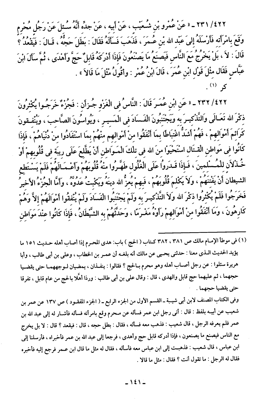 422/ 231 - " عَنْ عُمْرو بْنِ شُعَيْبٍ، عَنْ أَبِيه، عَنْ جدِّهِ أَنَّهُ سُئِلَ عَنْ رَجُلٍ مُحْرِمٍ وَقَعَ بِامْرَأَتِهِ فَأَرْسَلَهُ إِلَى عَبْدِ الله بْنِ عُمَرَ، فَذَهَبَ فَسَأَلَهُ فَقَالَ: بَطَلَ حَجُّهُ، قَالَ: فَيَقْعُدُ؟ قَالَ: لاَ، بَلْ يَخْرُجُ مَعَ النَّاسِ فَيَصنَعُ مَا يَصْنَعُونَ فَإِذَا أَدْرَكَهُ قَابِلٌ حَجَّ وَأَهْدَى، ثُمَّ سَأَلَ ابْنَ عَبَّاسٍ فَقَال مِثْلَ قَوْلِ ابْنِ عُمَرَ، قَالَ ابْنُ عُمْر: وأقُولُ مْثْلَ مَا قَالاَ ".