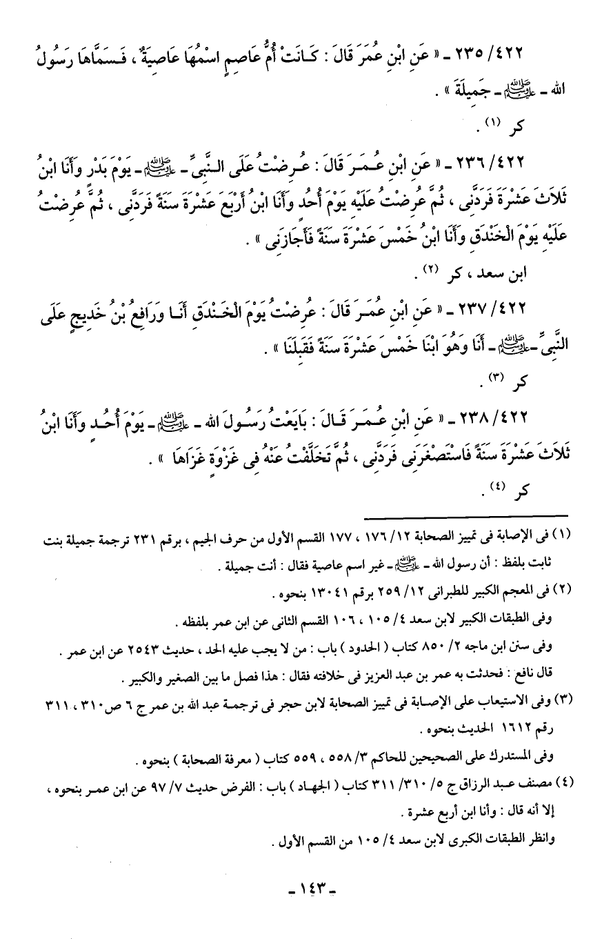 422/ 236 - "عَنِ ابْنِ عُمَرَ قَالَ: عُرِضْتُ عَلَى النَّبِىِّ - صلى الله عليه وسلم - يَوْمَ بَدْرٍ وَأَنَا ابْنُ ثَلاَثَ عَشْرَةَ فَرَدَّنِى، ثُمَّ عُرِضْتُ عَلَيْهِ يَوْمَ أُحُد وَأَنَا ابْنُ أَرْبَعَ عَشْرَةَ سَنَةً فَرَدَّنِى، ثُمَّ عُرِضْتُ عَلَيْهِ يَوْمَ الْخَنْدَقِ وَأَنَا ابْنُ خَمْسَ عَشْرَةَ سَنَةً فَأَجَازَنِى ".
