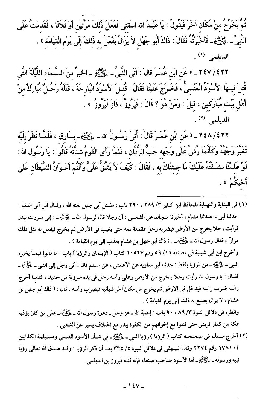 422/ 247 - " عَنِ ابْنِ عُمَرَ قَالَ: أَتَى النَّبِىَّ - صلى الله عليه وسلم - الخبرُ مِنَ السَّمَاء اللَّيْلَةَ التَّي قُتِلَ فِيهَا الأَسْوَدُ الْعَنْسِىُّ، فَخَرَجَ عَلَيْنَا فَقَالَ: قُتِلَ الأَسْوَدُ الْبَارِحَةَ، قَتَلَهُ رَجُلٌ مُبَارَك مِنْ أَهْلِ بَيْتٍ مُبَارَكِيِن، قِيلَ: وَمَنْ هُوَ؟ قَالَ: فَيْرُوزُ، فَازَ فَيْرُوزُ ".