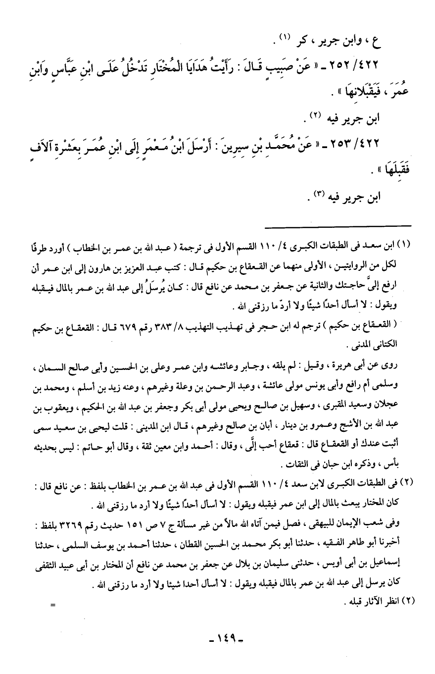 422/ 253 - " عَنْ مُحَمَّد بْنِ سيرِينَ: أَرْسَلَ ابْنُ مَعْمَر إِلَى ابْنِ عُمَرَ بعَشْرةِ آلاَفٍ فَقَبِلَهَا".