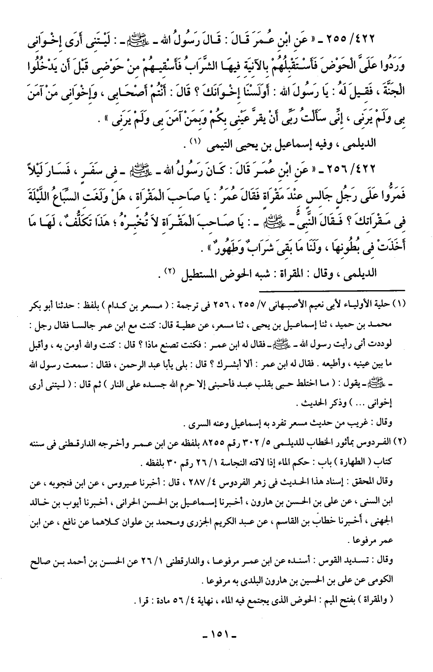 422/ 255 - " عَنِ ابْنِ عُمَرَ قَالَ: قَالَ رَسُولُ الله - صلى الله عليه وسلم -: لَيْتَنِى أَرَى إِخْوَانِى وَرَدُوا عَلَىَّ الْحَوْضَ فَأَسْتَقْبِلُهُمْ بالآنِيَةِ فِيهَا الشَّرَابُ فَأَسْقِيهُمْ مِن حَوْضِى قَبْلَ أَن يَدْخُلُوا الْجَنَّةَ، فَقِيلَ لَهُ: يَا رَسُولَ الله: أَوَلَسْنَا إِخْوَانَكَ؟ قَالَ: أَنْتُمْ أَصْحَابِى، وَإخْوَانِى مَنْ آمَنَ بِى وَلَمْ يَرَنِى، إِنِّى سَأَلْتُ رَبِّى أَنْ يقرَّ عَيْنِى بِكُمْ وَبِمَنْ آمَنَ بِى وَلَمْ يَرَنِى ".