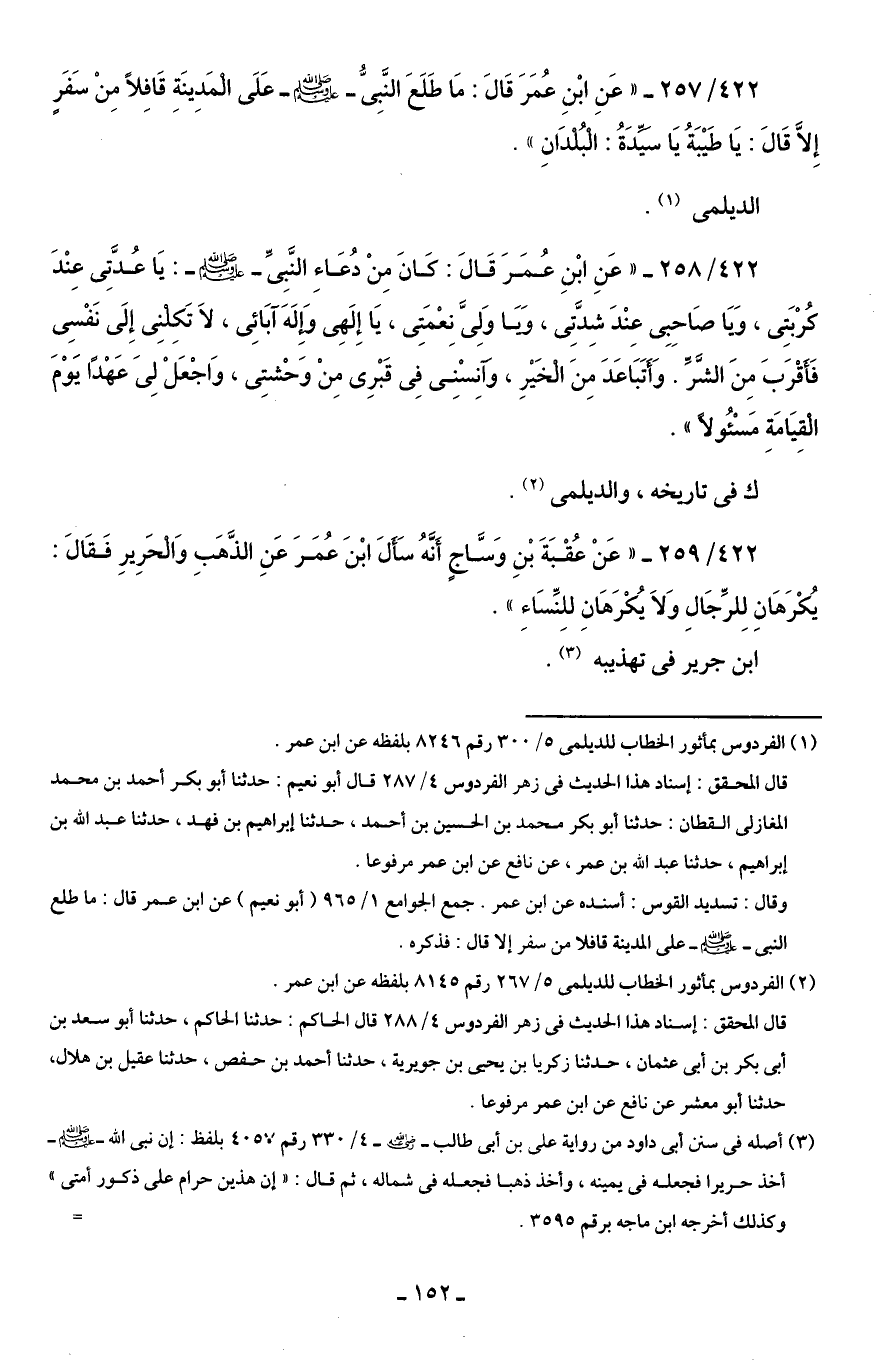 422/ 257 - " عَنِ ابْنِ عُمَرَ قَالَ: مَا طَلَعَ النَّبِىُّ - صلى الله عليه وسلم - عَلَى الْمَدِينَةِ قَافِلًا مِنْ سَفَرٍ إِلَّا قَالَ: يَا طَيْبَةُ يَا سيِّدَةُ: الْبُلْدَانِ ".