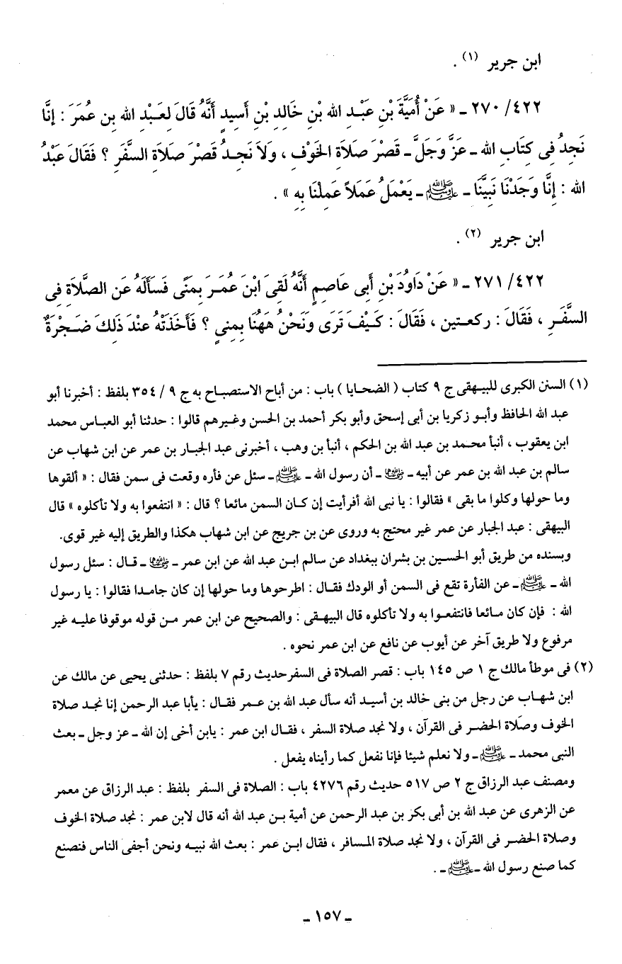 422/ 270 - " عَنْ أُمَيَّةَ بْنِ عَبْدِ الله بْنِ خَالِدِ بْنِ أَسِيد أَنَّهُ قَالَ لِعَبْدِ الله بِن عُمَرَ: إنَّا نَجِدُ فِى كتَابِ الله - عَزَّ وَجَلَّ - قَصْرَ صَلاَةِ الخَوْفِ، وَلاَ نَجِدُ قَصْرَ صَلاَةِ السَّفَرِ؟ فَقَالَ عَبْدُ الله: إِنَّا وَجَدْنَا نَبِيَّنَا - صلى الله عليه وسلم - يَعْمَلُ عَمَلًا عَمِلْنَا بِهِ ".