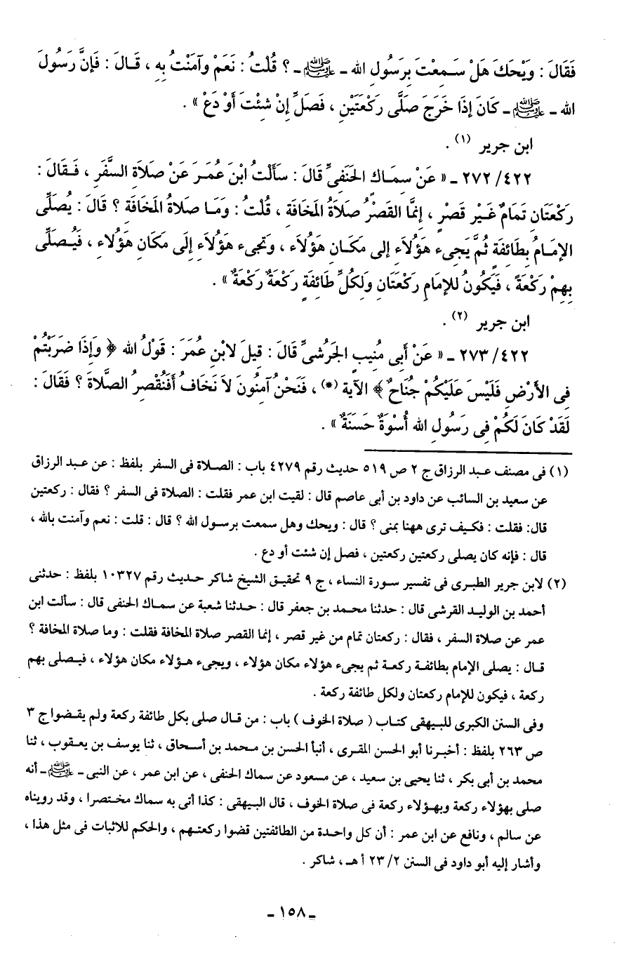 422/ 272 - "عَنْ سِمَاكٍ الحَنَفِىِّ قَالَ: سَأَلْتُ ابْنَ عُمَرَ عَنْ صَلاَةِ السَّفَرِ، فَقَالَ: رَكْعَتَانِ تَمَامٌ غَيْر قَصْرٍ، إِنَّما القَصْرُ صَلاَةُ المَخَافَةِ، قُلْتُ: وَمَا صَلاةُ المَخَافَةِ؟ قَالَ: يُصَلِّى الإمَامُ بِطَائِفَةٍ ثُمَّ يَجِئ هَؤُلاَءِ إلى مَكَانِ هَؤُلاَء، وَتجيء هَؤُلاَءِ إِلَى مَكَانِ هَؤُلاءِ، فَيُصَلِّى بِهِمْ رَكْعَةً، فَيَكُونُ للإمَامِ رَكْعَتَانِ وَلِكُلِّ طَائِفَةٍ رَكْعَةٌ رَكْعَةٌ".