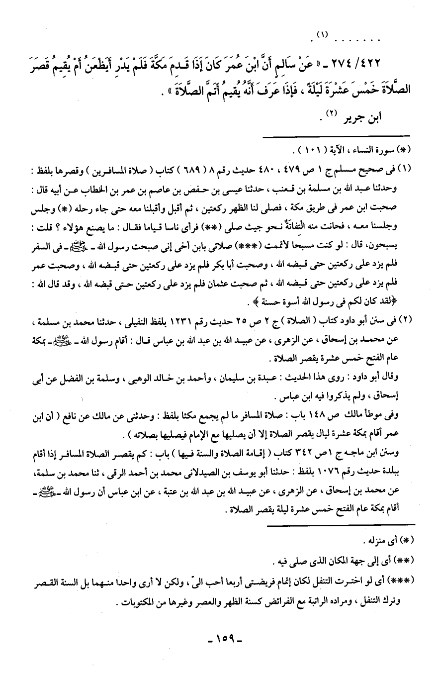 422/ 274 - " عَنْ سَالِمٍ أَنَّ ابْنَ عُمَرَ كَانَ إِذَا قَدِمَ مَكَّةَ فَلَمْ يَدْرِ أيَظْعَنُ أَمْ يُقِيمُ قَصَرَ الصَّلاَةَ خَمْسَ عَشْرَةَ لَيْلَةً، فَإذَا عَرَفَ أَنَّهُ يُقيمُ أَتَمَّ الصَّلاَةَ ".