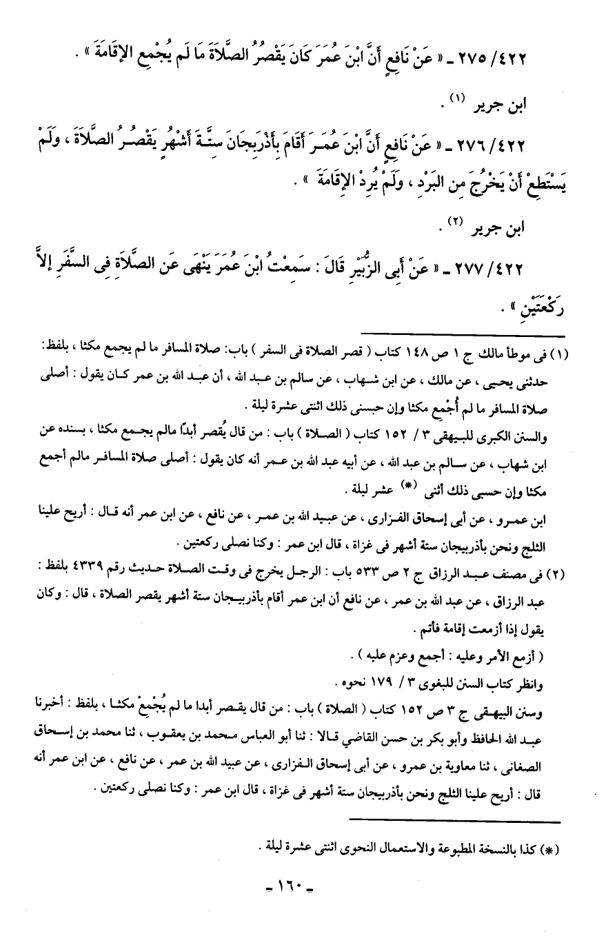 422/ 275 - " عَنْ نَافِعٍ أَنَّ ابْنَ عُمَرَ كَانَ يَقْصُرُ الصَّلاَةَ مَا لَم يُجْمِع الإقَامَةَ ".
