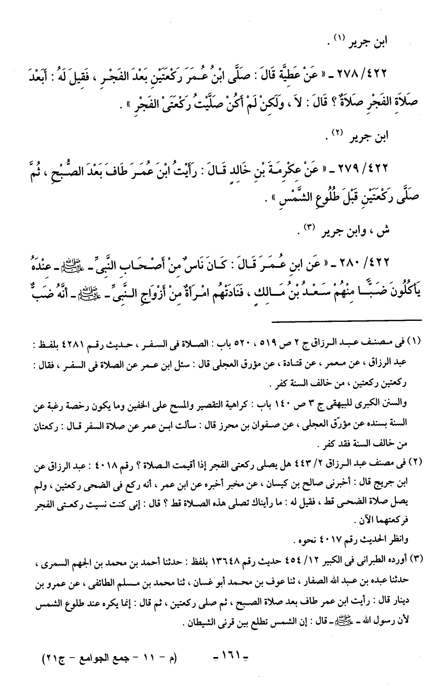 422/ 279 - " عَنْ عكْرِمَةَ بْنِ خَالِدٍ قَالَ: رَأَيْتُ ابْنَ عُمَرَ طَافَ بَعْدَ الصُّبْحِ، ثُمَّ صَلَّى رَكْعَتَيْنِ قَبْلَ طُلُوعِ الشَّمسِ ".