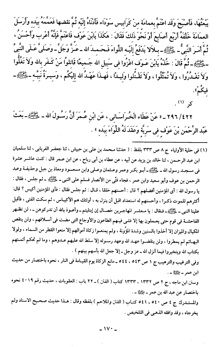 422/ 296 - "عَنْ عَطَاء الْخُرَاسَانِى، عَن ابْنِ عُمَرَ أنَّ رَسُولَ الله - صلى الله عليه وسلم - بَعَثَ عَبْد الرَّحْمَن بْنَ عَوْفٍ فِى سَرِيَّةٍ وَعَقَدَ لَهُ اللِّوَاءَ بِيَدهِ".
