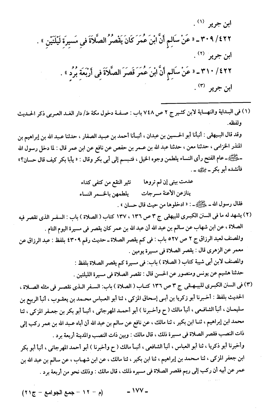 422/ 309 - "عَنْ سَالِمٍ أنَّ ابْنَ عُمَرَ كانَ يَقْصُرُ الصَّلاَةَ في مَسيِرَةِ لَيْلَتَيْنِ".
