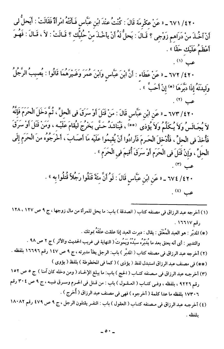 420/ 673 - "عَنِ ابْنِ عَبَّاسٍ قَالَ: مَنْ قَتَلَ أَوْ سَرَقَ في الْحِلِّ، ثُمَّ دَخَلَ الْحَرَمَ فَإِنَّهُ لاَ يُجَالَسُ وَلاَ يُكَلَّمُ وَلاَ يُؤذى (* *)، فَيُنَاشَدُ حَتَّى يَخْرُجَ ليُقامَ عَلَيْهِ، وَمَنْ قَتَلَ أَوْ سَرَقَ فَأُخِذَ في الْحِلِّ، فَأدْخِلَ الْحَرمَ فَأَرادُوا أَنْ يُقيمُوا عَلَيْه مَا أَصَابَ، أَخْرَجُوُه منَ الْحَرمِ إِلَى الْحِلِّ، وَإنْ قَتَلَ في الْحَرَم أَوْ سَرَقَ أُقيمَ في الْحَرَمِ".