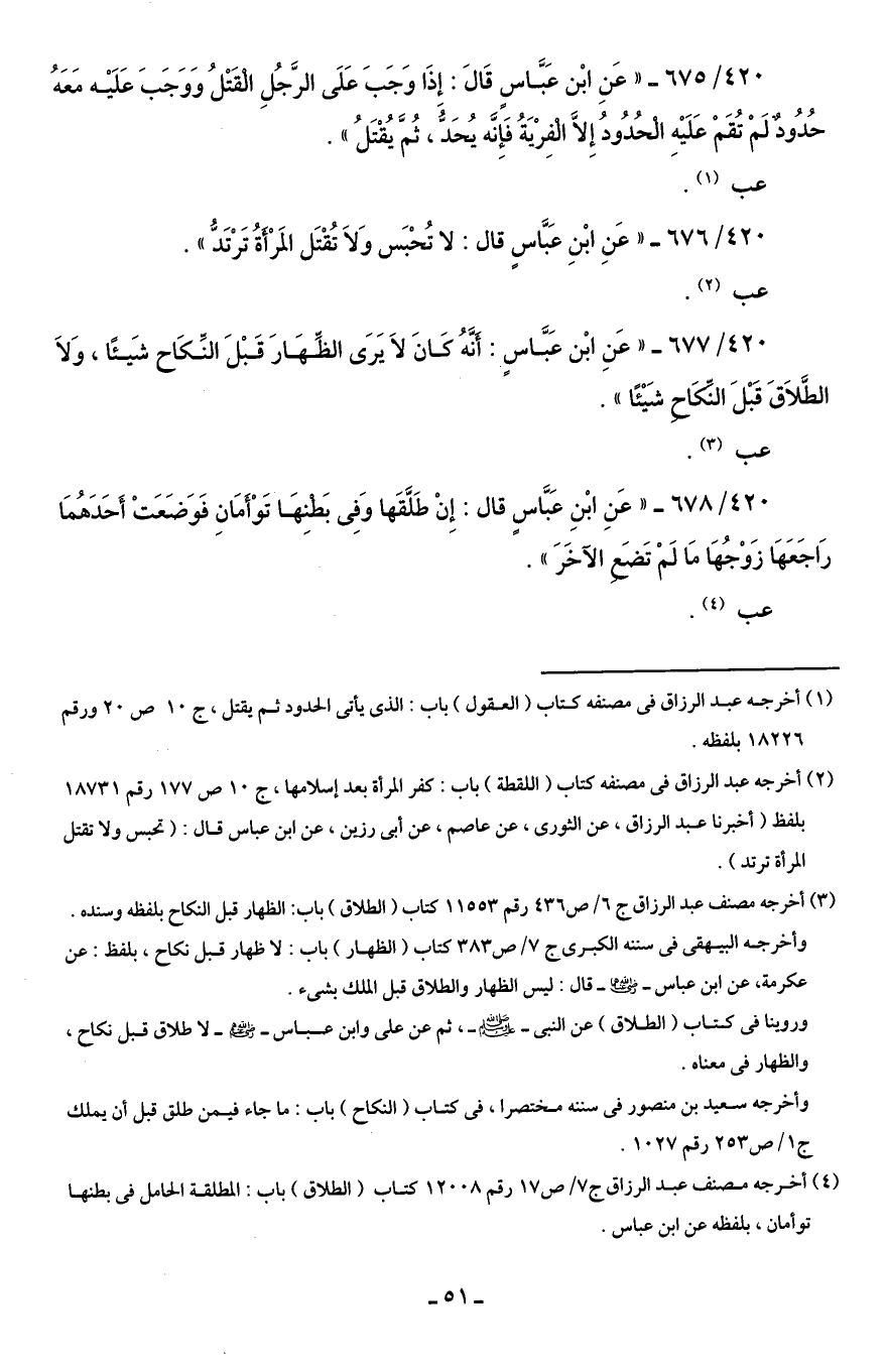 420/ 676 - "عَنِ ابْنِ عَبَّاسٍ قال: لا تُحْبَس وَلاَ تُقْتَل المَرْأَةُ تَرْتدُّ".