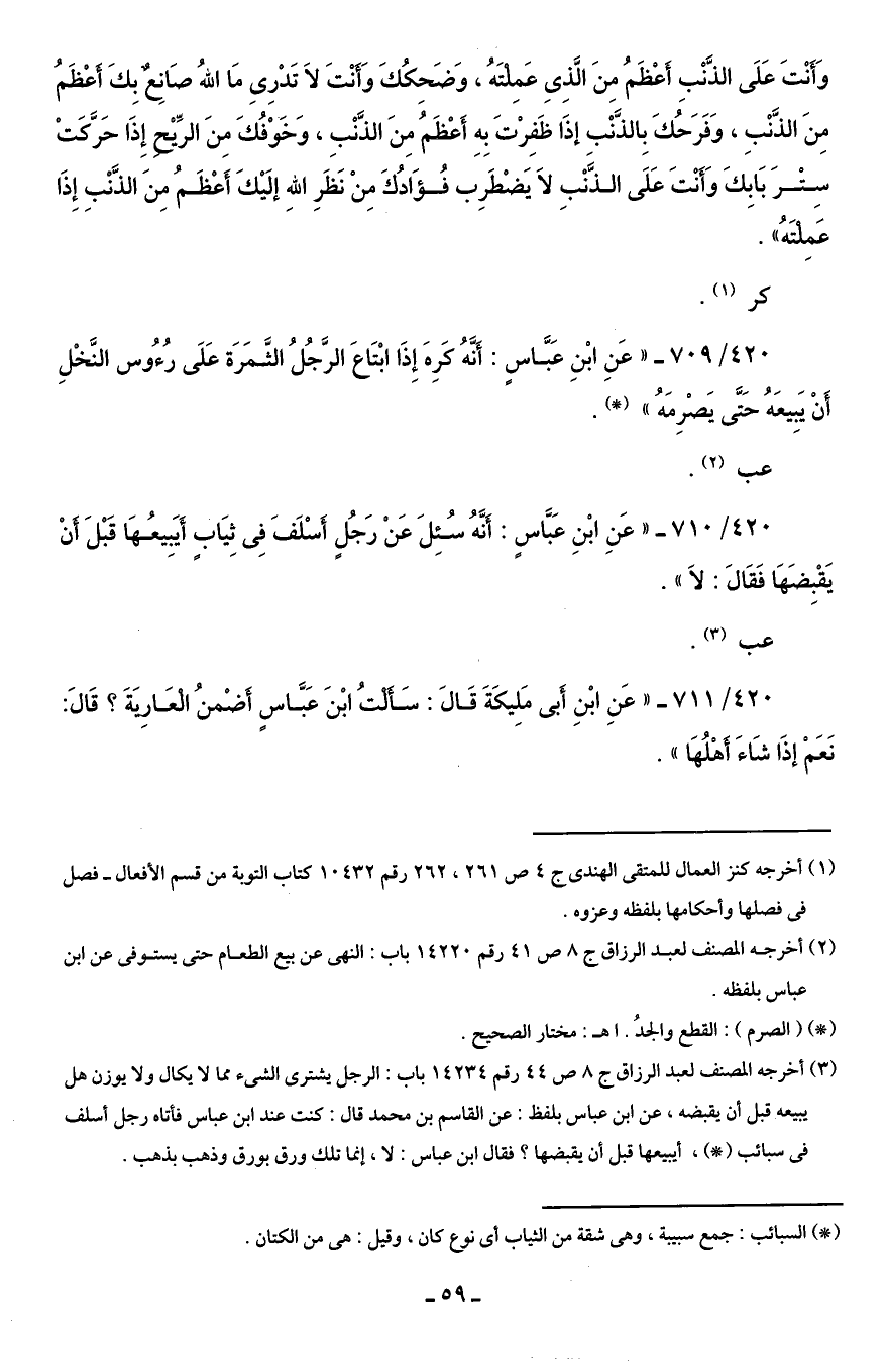 420/ 710 - "عَنِ ابْنِ عَبَّاسٍ: أَنَّهُ سُئِلَ عَنْ رَجُلٍ أَسْلَفَ فِى ثِيَابٍ أَيَبِيعُهَا قَبْلَ أَنْ يَقْبِضَهَا فَقَالَ: لاَ".