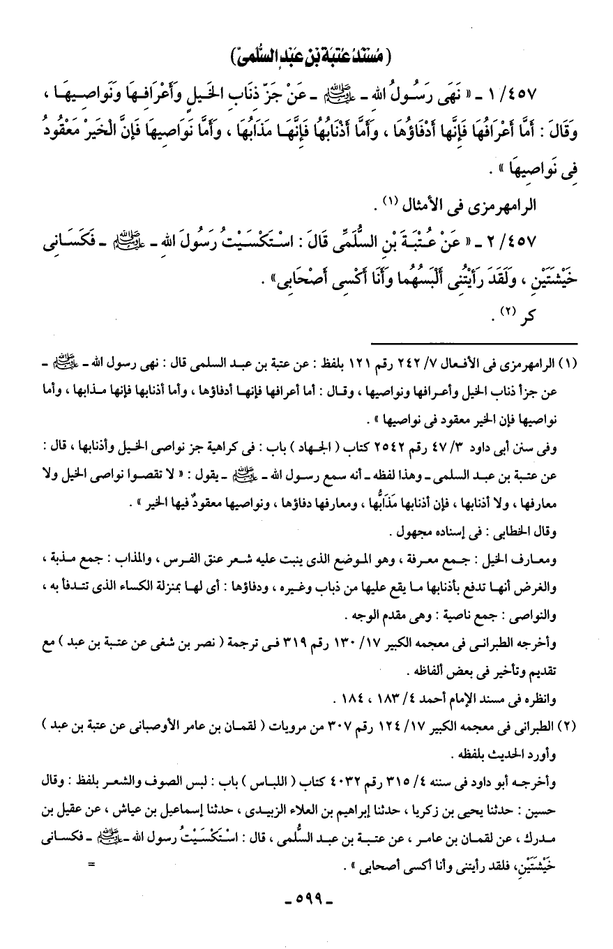(¬1) الرامهرمزى في الأفعال 7/ 242 رقم 121 بلفظ: عن عتبة بن عبد السلمى قال: نهى رسول الله - صلى الله عليه وسلم - عن جزأ ذناب الخيل وأعرافها ونواصيها، وقال: أما أعرافها فإنها أدفاؤها، وأما أذنابها فإنها مذابها، وأما نواصيها فإن الخير معقود في نواصيها".