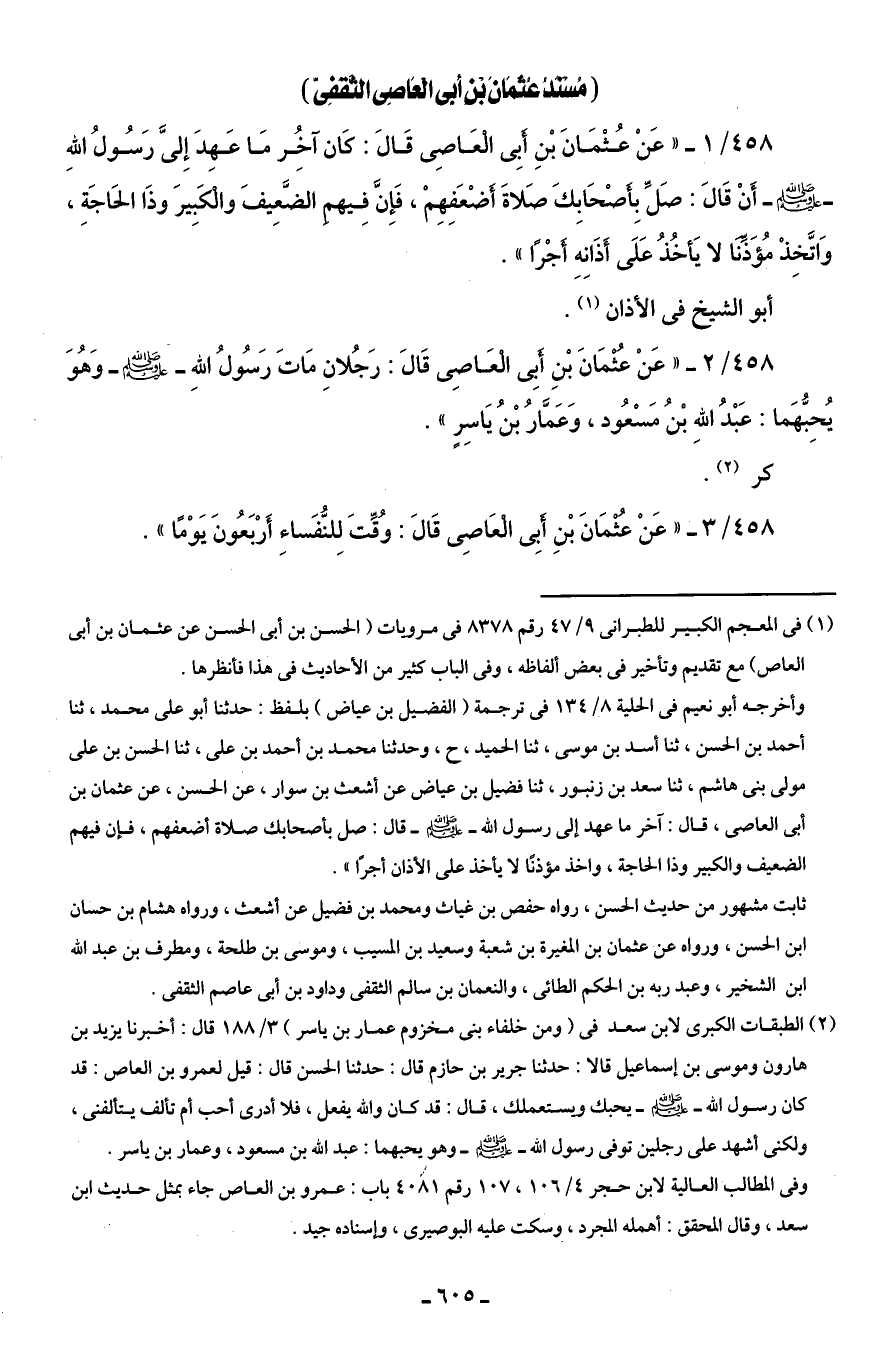 458/ 1 - " عَنْ عُثْمَانَ بْنِ أَبِى الْعَاصِى قَالَ: كَان آخُر مَا عَهِدَ إِلىَّ رَسُولُ اللهِ - صلى الله عليه وسلم - أَنْ قَالَ: صَلِّ بأَصْحَابِكَ صَلاةَ أَضْعَفِهِمْ، فَإِنَّ فِيهمِ الضَّعِيفَ والْكَبِيرَ وذَا الحَاجَةِ، وَاتَّخِذْ مُؤَذَّنًا لا يَأخُذُ عَلَى أَذَانِهِ أَجْرًا".