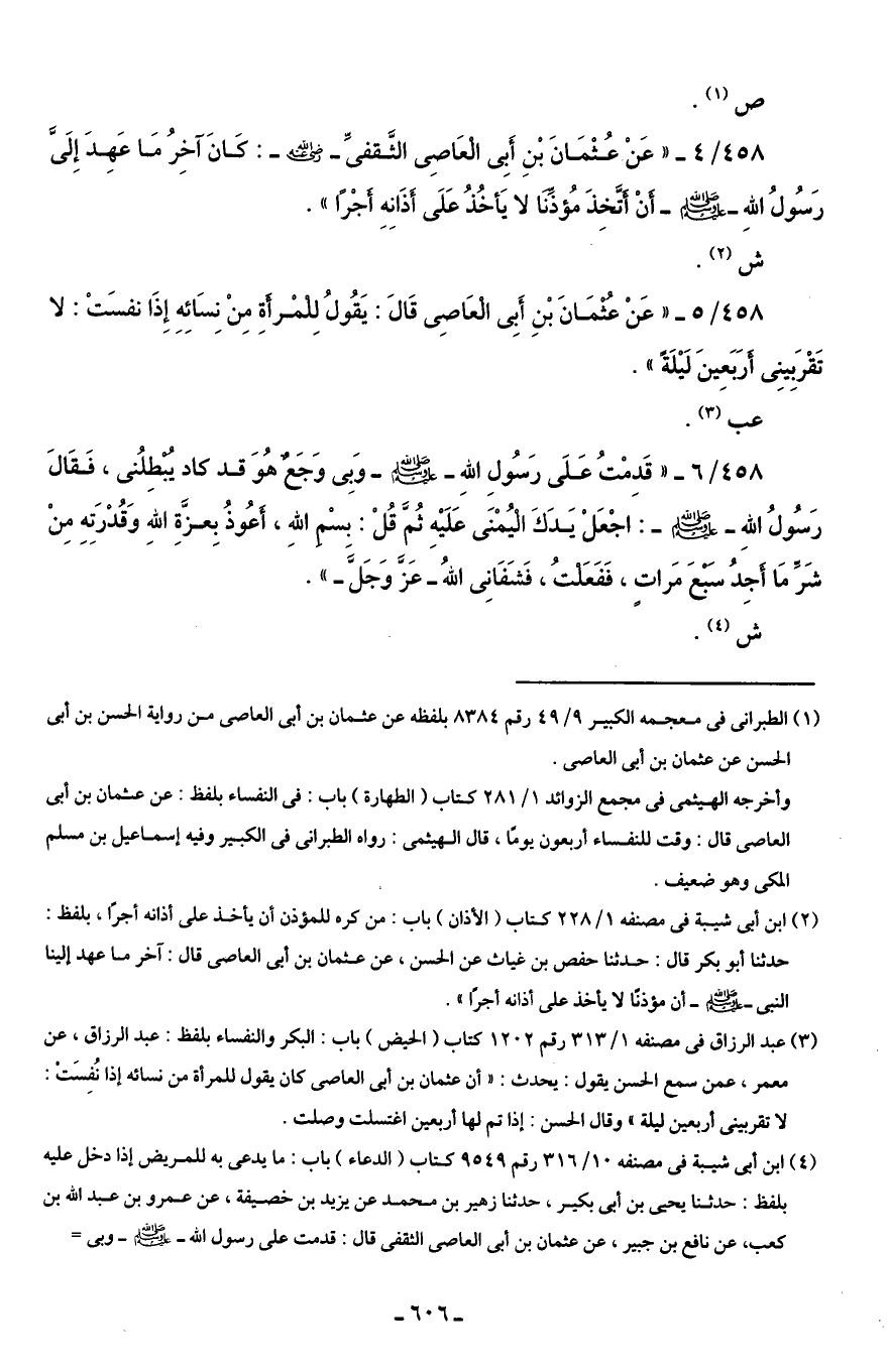 458/ 5 - "عَنْ عُثْمَانَ بْنِ أَبِى الْعَاصِى قَالَ: يَقُولُ لِلْمَرْأَةِ مِنْ نِسَائِهِ إِذَا نفسَتْ: لا تَقْرَبِينِى أَرَبَعِينَ لَيْلَةً".