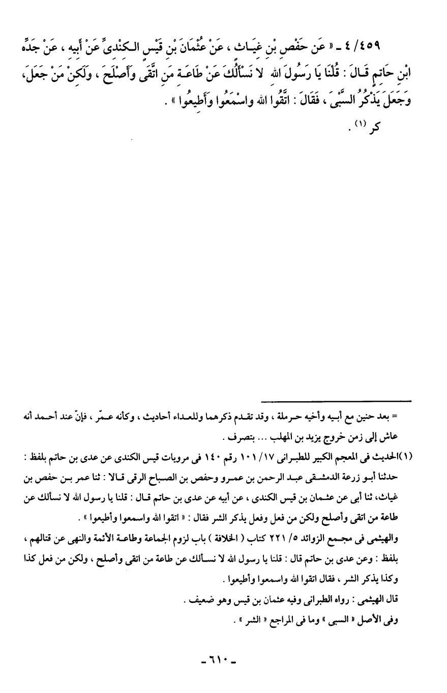 459/ 4 - "عَن حَفْصِ بْنِ غِيَاثٍ، عَنْ عُثْمَانَ بْنِ قَيْسٍ الكِنْدِىِّ عَنْ أَبِيهِ، عَنْ جَدِّه ابْنِ حَاتِمٍ قَالَ: قُلْنَا يَا رَسُولَ اللهِ لا نَسْأَلُكَ عَنْ طَاعَةِ مَنِ اتَّقَى وأَصْلَحَ، وَلَكِنْ مَنْ جَعَلَ، وَجَعَلَ يَذْكُرُ السَّبْىَ، فَقَالَ: اتَّقُوا الله واسْمَعُوا وَأَطِيعُوا".