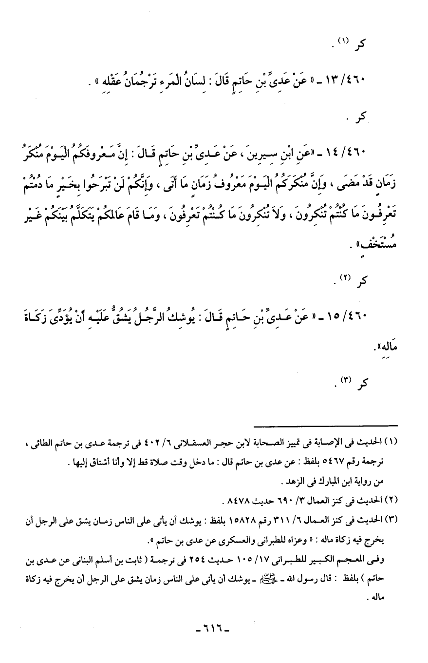 460/ 15 - "عَنْ عَدِىِّ بْنِ حَاتِمٍ قَالَ: يُوشِكُ الرَّجُلُ يَشُقُّ عَلَيْهِ أنْ يُؤَدِّىَ زَكَاةَ مَالِهِ".