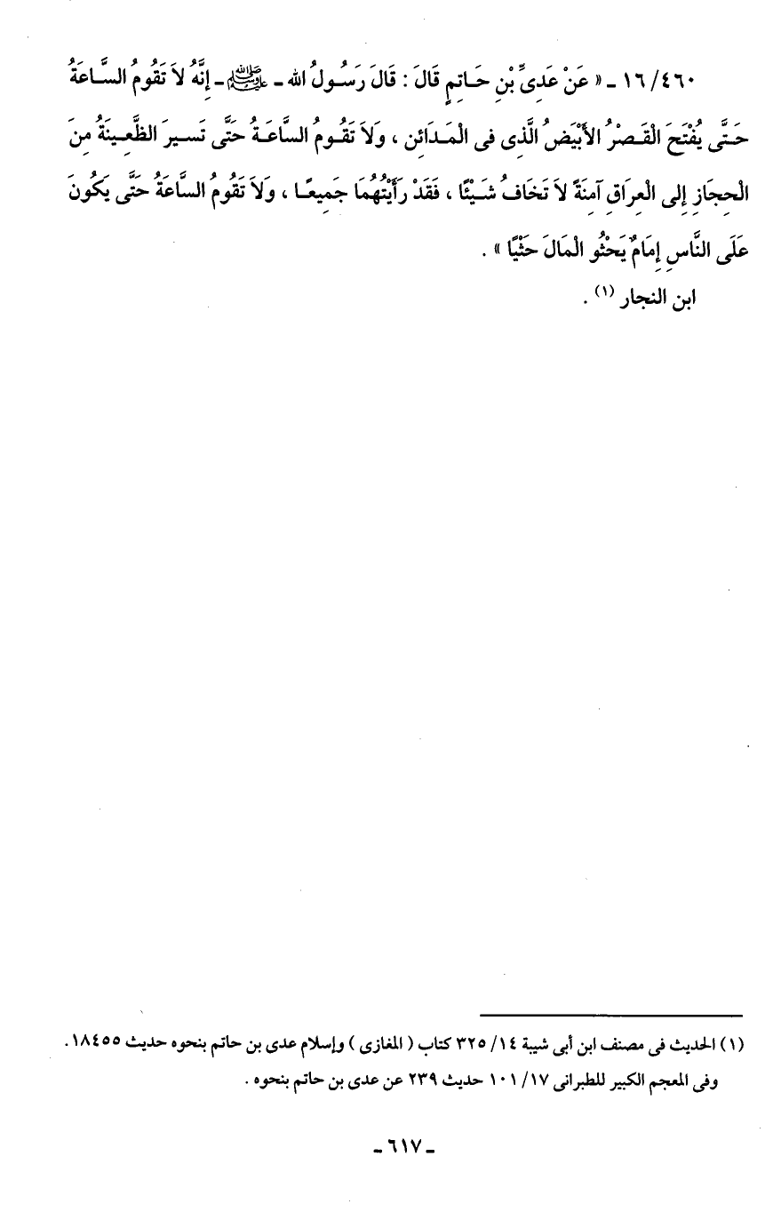 460/ 16 - "عَنْ عَدِىِّ بْنِ حَاتِمٍ قَالَ: قَالَ رَسُولُ الله - صلى الله عليه وسلم - إِنَّهُ لَا تَقُومُ السَّاعَةُ حَتَّى يُفْتَحَ الْقَصْرُ الأَبْيَضُ الَّذِى في الْمَدَائِن، وَلَا تَقُومُ السَّاعَةُ حَتَّى تَسيرَ الظَّعِينَةُ مِنَ الْحِجَازِ إِلى الْعِرَاقِ آمِنَةً لَا تَخَافُ شَيْئًا، فَقَدْ رَأَيْتُهُمَا جَمِيعًا، وَلَا تَقُومُ السَّاعَةُ حَتَّى يَكُونَ عَلَى النَّاسِ إِمَامٌ يَحْثُو الْمَالَ حَثْيًا".
