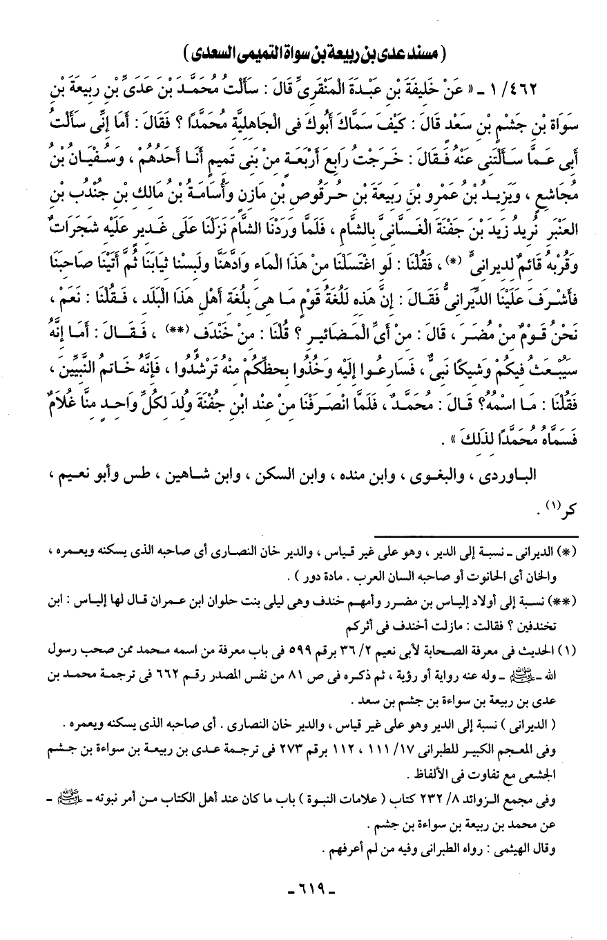 462/ 1 - " عَنْ خَلِيفَةَ بْنِ عَبْدَةَ الْمَنْقَرِىِّ قَالَ: سَأَلْتُ مُحَمَّدَ بْنَ عَدَىِّ بْنِ رَبِيعَةَ بْنِ سَوَاة بْنِ جَشْمٍ بنِ سَعْدٍ قَالَ: كَيْفَ سَمَّاكَ أَبُوكَ في الْجَاهِلِيَّةِ مُحَمَّدًا؟ فَقَالَ: أَمَا إِنِّى سَأَلْتُ أَبِى عَمَّا سَألْتَنِى عَنْهُ فَقَالَ: خَرَجْتُ رَابِعَ أَرْبَعَةٍ مِنْ بَنِى تَمِيمٍ أَنَا أَحَدُهُمْ، وَسُفْيَانُ بْنُ مُجَاشِعٍ، وَيَزِيدُ بْنُ عَمْرِو بْنِ رَبِيعَةَ بْنِ حُرَقُوصِ بْنِ مَازِنٍ وَأُسَامَةُ بْنُ مَالِكِ بْنِ جندُب بْنِ العَنْبَرِ نُرِيدُ زَيدَ بْنَ جَفْنَةَ الْغَسَّانِىَّ بِالشَّامِ، فَلَمَّا وَرَدْنَا الشَّامَ نَزَلْنَا عَلَى غَدِيرٍ عَلَيْهِ شَجَرَاتٌ وَقُرْبهُ قَائِمٌ لِدِيرانِىٍّ (*)، فَقُلْنَا: لَوِ اغْتَسَلْنَا مِنْ هَذَا الْمَاءِ وَادَّهَنَّا ولَبِسْنا ثيَابَنَا ثُمَّ أَتَيْنَا صَاحِبَنَا فأَشْرَفَ عَلَيْنَا الدِّيرانِىُّ فَقَالَ: إِنَّ هَذِهِ لَلُغَةُ قَوْمٍ مَا هِىَ بِلُغَةِ أَهْلِ هَذَا اَلْبَلَدِ، فَقُلْنَا: نَعَمْ، نَحْنُ قَوْمٌ مِنْ مُضَرَ، قَالَ: مِنْ أَىِّ الْمَضَائيرِ؟ قُلْنَا: مِنْ خَنْدَفٍ (* *)، فَقَالَ: أَمَا إِنَّهُ سَيُبْعَثُ فِيكُمْ وَشِيكًا نَبِىٌّ، فَسَارِعُوا إِلَيْهِ وَخُذُوا بِحظِّكُمْ مِنْهُ تَرْشُدُوا، فَإِنَّهُ خَاتمُ النَّبِيِّينَ، فَقُلنَا: مَا اسْمُهُ؟ قَالَ: مُحَمَّدٌ، فَلَمَّا انْصَرَفْنَا مِنْ عِنْد ابْنِ جُفْنَةَ وُلِدَ لِكُلِّ وَاحِدٍ مِنَّا غُلَامٌ فَسَمَّاهُ مُحَمَّدًا لِذَلِكَ".