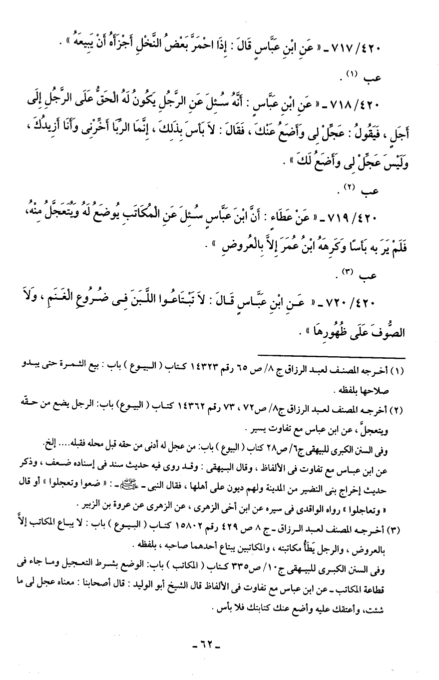 (¬2) أخرجه المصنف لعبد الرزاق ج 8/ ص 72، 73 رقم 14362 كتاب (البيوع) باب: الرجل يضع من حقّه ويتعجلَّ، عن ابن عباس مع تفاوت يسير.