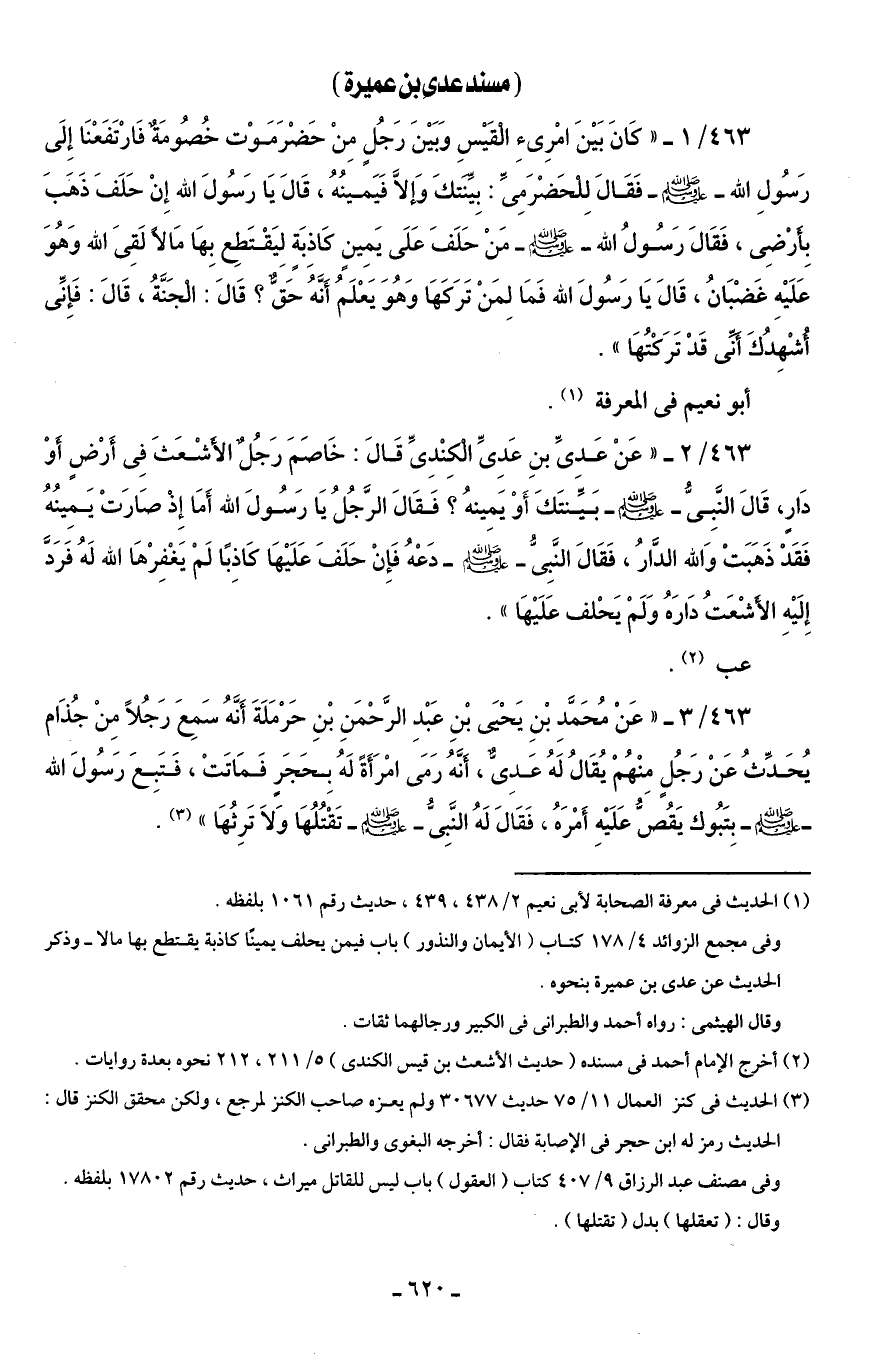 463/ 2 - "عَنْ عَدىِّ بنِ عَدِىِّ الْكِنْدِىِّ قَالَ: خَاصَمَ رَجُلٌ الأَشْعَثَ فِى أَرْضٍ أَوْ دَارٍ، قَالَ النَّبِىُّ - صلى الله عليه وسلم - بَيِّنتَكَ أَوْ يَمِينهُ؟ فَقَالَ الرَّجُلُ يَا رَسُولَ الله أَمَا إِذ صَارَتْ يَمِينُهُ فَقَدْ ذَهَبَتْ وَالله الدَّارُ، فَقَالَ النَّبِىُّ - صلى الله عليه وسلم - دَعْهُ فَإِنْ حَلَفَ عَلَيْهَا كَاذِبًا لَمْ يَغْفِرْهَا الله لَهُ فَرَدَّ إِلَيْهِ الأَشْعَتُ دَارَهُ وَلَمْ يَحْلف عَلَيْهَا".