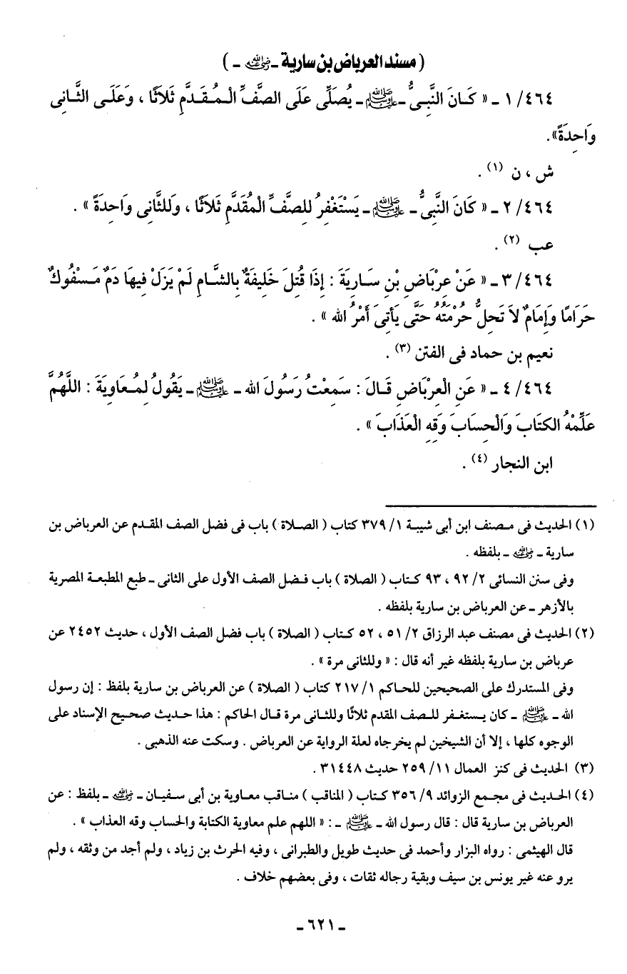 464/ 4 - "عَنِ الْعِرْبَاضِ قَالَ: سَمِعْتُ رَسُولَ الله - صلى الله عليه وسلم - يَقُولُ لِمُعَاوِيَةَ: اللَّهُمَّ عَلِّمْهُ الكتَابَ وَالْحِسَابَ وَقِهِ الْعَذَابَ".