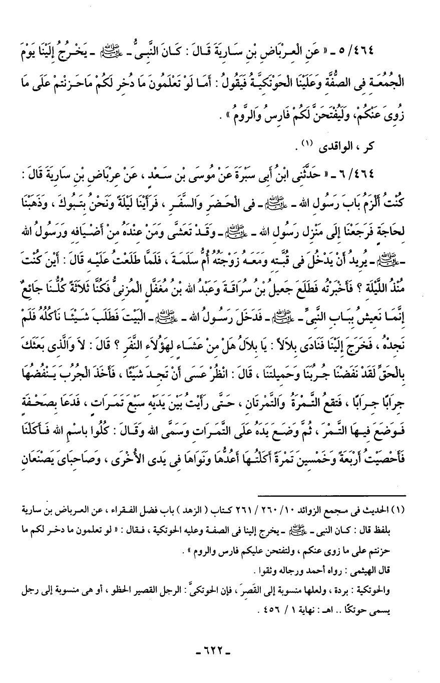 464/ 6 - "حَدَّثَنِى ابْنُ أَبِى سَبْرَةَ عَنْ مُوسَى بْن سَعْدٍ، عَنْ عِرْبَاضِ بْنِ سَارِيَةَ قَالَ: كُنْتُ ألْزَمُ بَابَ رَسُولِ الله - صلى الله عليه وسلم - في الْحَضَرِ وَالسَّفَرِ، فَرَأَيْنَا لَيْلَةً وَنَحْنُ بِتَبُوكَ، وَذَهَبْنَا لِحَاجَةٍ فَرَجَعْنَا إِلَى مَنْزِل رَسُولِ الله - صلى الله عليه وسلم - وَقَدْ تَعَشَّى وَمَنْ عِنْدَهُ مِنْ أَضْيَافِهِ وَرَسُولُ الله - صلى الله عليه وسلم - يُرِيدُ أَنْ يَدْخُلَ في قُبَّتِهِ وَمَعَهُ زَوْجَتُهُ أُمُّ سَلَمَةَ، فَلَمَّا طَلَعْتُ عَلَيْهِ قَالَ: أَيْنَ كُنْتَ مُنْذُ اللَّيْلَةِ؟ فَأَخْبَرْتُه فَطَلَعَ جَعيلُ بْنُ سُرَاقَةَ وَعَبْدُ الله بْنُ مُغَفَّلٍ الْمُزنِىُّ فَكُنَّا ثَلَاثَةً كُلُّنَا جَائِعٌ إِنَّمَا نَعِيشُ بِبَابِ النَّبِىِّ - صلى الله عليه وسلم - فَدَخَلَ رَسُولُ الله - صلى الله عليه وسلم - الْبَيْتَ فَطَلَبَ شَيْئًا نَأكُلُهُ فَلَمْ نَجِدْهُ، فَخَرَجَ إِلَيْنَا فَنَادَى بِلَالًا: يَا بِلَالُ هَلْ مِنْ عَشَاءٍ لِهَؤُلَاءِ النَّفَرِ؟ قَالَ: لَا وَالَّذِى بَعَثَكَ بِالْحَقِّ لَقَدْ نَفَضْنَا جُرُبَنَا وَحَمِيلتَنَا، قَالَ: انْظُرْ عَسَى أَنْ تَجِدَ شَيْئًا، فَأَخذَ الْجُرُبَ يَنْفُضُهَا جِرَابًا جِرَابًا، فَتقعُ التَّمْرَةُ وَالتَّمْرتَانِ، حَتَّى رَأَيْتُ بَيْنَ يَدَيْهِ سَبع تَمَرَاتٍ، فَدَعَا بِصَحْفَةٍ فَوَضَعَ فِيهَا التَّمْرَ، ثُمَّ وَضَعَ يَدَهُ عَلَى التَّمَرَاتِ وَسَمَّى الله وَقَالَ: كُلُوا باسْمِ الله فَأكَلْنَا فَأَحْصَيْتُ أَرْبَعَةً وَخَمْسِينَ تَمْرَةً أَكَلْتُهَا أَعُدُّهَا وَنَوَاهَا فِى يَدى الأُخْرَى، وَصَاحِبَاىَ يَصْنَعَانِ