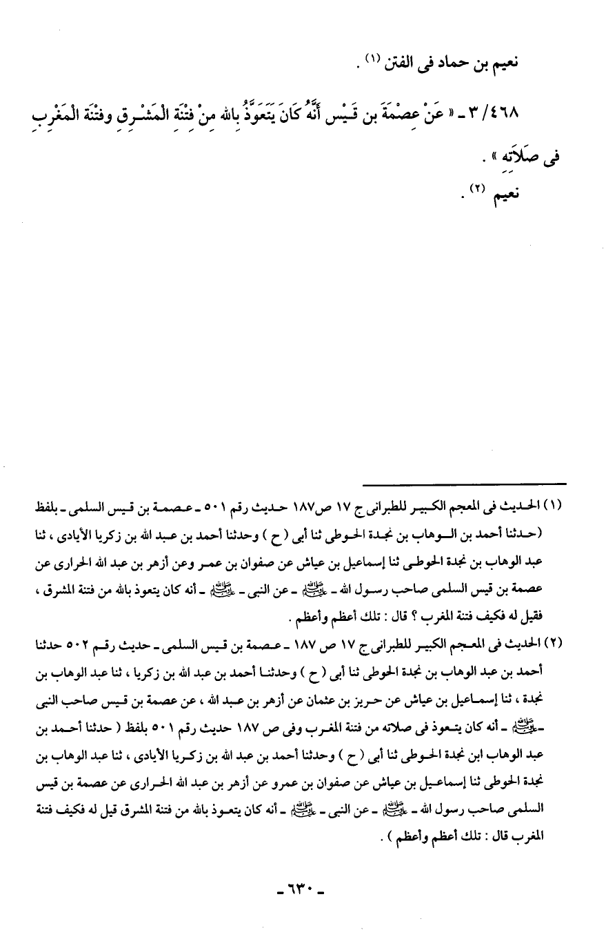 (¬2) الحديث في المعجم الكبير للطبرانى ج 17 ص 187 - عصمة بن قيس السلمى - حديث رقم 502 حدثنا أحمد بن عبد الوهاب بن نجدة الحوطى ثنا أبى (ح) وحدثنا أحمد بن عبد الله بن زكريا، ثنا عبد الوهاب بن نجدة، ثنا إسماعيل بن عياش عن حريز بن عثمان عن أزهر بن عبد الله، عن عصمة بن قيس صاحب النبى - صلى الله عليه وسلم - أنه كان يتعوذ في صلاته من فتنة المغرب وفى ص 187 حديث رقم 501 بلفظ (حدثنا أحمد بن عبد الوهاب بن نجدة الحوطى ثنا أبى (ح) وحدثنا أحمد بن عبد الله بن زكريا الأيادى، ثنا عبد الوهاب بن نجدة الحوطى ثنا إسماعيل بن عياش عن صفوان بن عمرو عن أزهر بن عبد الله الحرارى عن عصمة بن قيس السلمى صاحب رسول الله - صلى الله عليه وسلم - عن النبى - صلى الله عليه وسلم - أنه كان يتعوذ بالله من فتنة المشرق قيل له فكيف فتنة المغرب قال: تلك أعظم وأعظم).