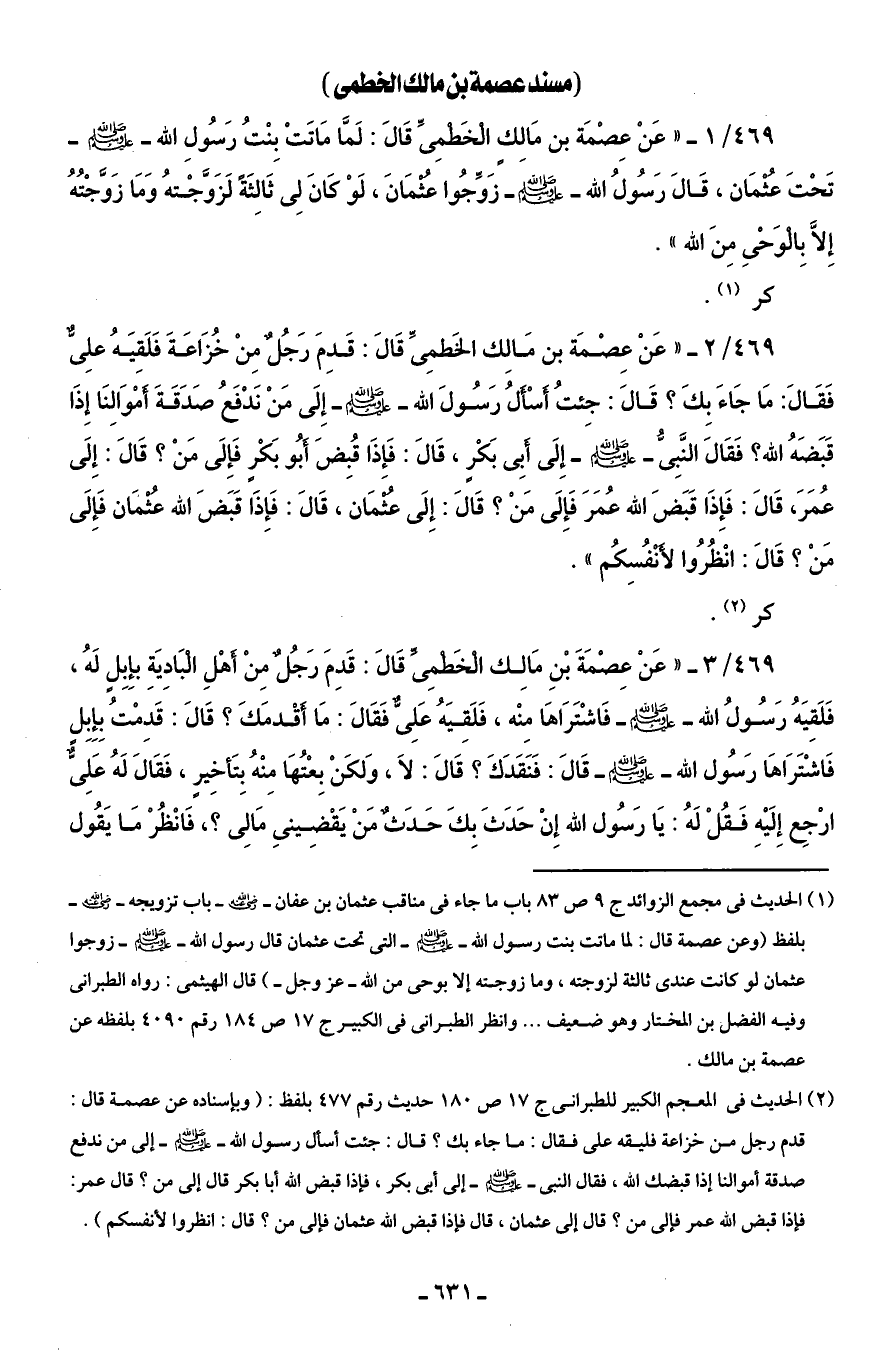 469/ 2 - "عَنْ عِصْمَة بن مَالِك الخَطمِىِّ قَالَ: قَدِمَ رَجُلٌ مِنْ خُزَاعَةَ فَلَقيَهُ علِىٌّ فَقَالَ: مَا جَاءَ بِكَ؟ قَالَ: جِئتُ أَسْأَلُ رَسُولَ الله - صلى الله عليه وسلم - إِلَى مَنْ نَدْفَعُ صَدَقَةَ أَموَالِنَا إِذَا قَبَضَهُ الله؟ فَقَالَ النَّبِىُّ - صلى الله عليه وسلم - إِلَى أَبِى بَكْرٍ، قَالَ: فَإذَا قُبِضَ أَبُو بَكْرٍ فَإِلَى مَنْ؟ قَالَ: إِلَى عُمَرَ، قَالَ: فَإِذَا قَبَضَ الله عُمَرَ فَإِلَى مَنْ؟ قَالَ: إِلَى عُثْمَان، قَالَ: فَإِذَا قَبَضَ الله عُثْمَان فَإِلَى مَنْ؟ قَالَ: انْظُرُوا لأَنْفُسِكُم".