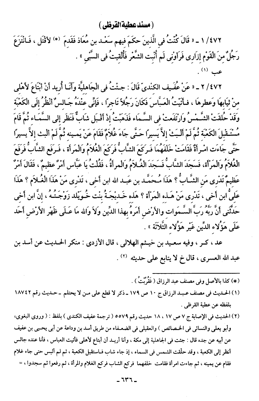472/ 2 - "عَنْ عُفَيف الكِنْدىّ قَالَ: جئْتُ في الْجَاهِلِيَّة وَأَنَا أُرِيد أَنْ أبْتَاعَ لأَهْلِى مِنْ ثِيَابِهَا وَعطرهَا، فأَتَيْتُ الْعَبَّاسَ فَكَانَ رَجُلًا تَاجِرًا، فَإنِّى عِنْدَهُ جَالِسٌ أنْظُرُ إِلَى الْكَعْبَةِ وَقَدْ حُلقَتْ الشَّمْسُ وَارْتَفَعتْ فِى السَّمَاء فَذَهَبْتُ إِذْ أَقْبَل شَابٌّ فَنَظَر إِلى السَّمَاءِ ثُمَّ قَامَ مُسْتَقْبِلَ الْكَعْبَةِ ثُمَّ لَمْ أَلْبَثْ إِلَّا يَسيرًا حَتَّى جَاءَ غُلَامٌ فَقَامَ عَنْ يَمينهِ ثُمَّ لَمْ ألْبث إِلَّا يسيرًا حَتَّى جَاءَت امْرأَةٌ فَقَامَتْ خَلْفَهُمَا فَرَكَعَ الشَّابُّ فَرَكَعَ الْغُلَامُ وَالْمَرأَة، فَرَفَع الشَّابُّ فَرَفَعَ الْغُلَامُ وَالْمَرْأَة، فَسَجَدَ الشَّابُّ فَسَجَدَ الْغُلَامُ وَالْمرأَةُ، فَقُلْتُ يَا عَبَّاس أَمْرٌ عظِيمٌ، فَقَالَ أَمْرٌ عَظِيمٌ تَدْرِى مَنِ الشَّابُّ؟ هَذَا مُحَمَّد بن عَبد الله ابن أَخِى، تَدْرِى مَنْ هَذَا الْغُلَام؟ هَذَا عَلِىُّ ابن أَخى، تَدْرِى مَنْ هَذِهِ الْمَرْأَة؟ هَذِهِ خَدِيْجَةُ بِنْت خُوَيْلد زَوْجَتُهُ، إِنَّ ابن أَخِى حَدَّثَنى أَنَّ رَبَّهُ رَبَّ السَّمَواتِ والأَرْضِ أَمَرهُ بِهذا الدِّين وَلَا وَالله مَا عَلَى ظَهْر الأَرْضِ أَحَد عَلَى هَؤُلاءِ الدِّين غَيْر هَؤُلاءِ الثَّلَاثَة".