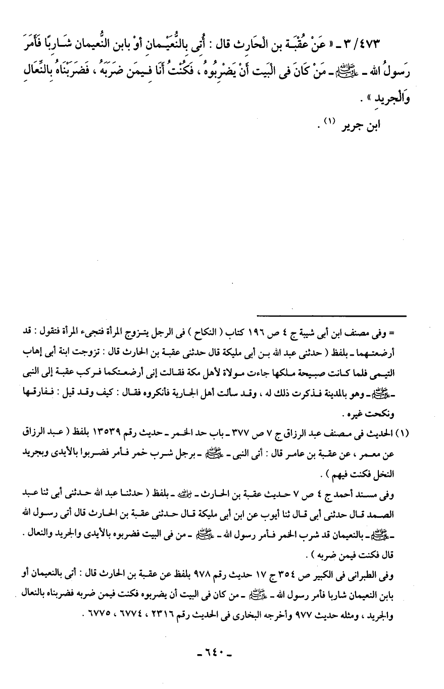 473/ 3 - "عَنْ عُقْبَة بن الْحَارِث قال: أُتِى بالنُّعَيْمانِ أوْ بابن النُّعيمان شَارِبًا فَأَمَرَ رَسولُ الله - صلى الله عليه وسلم - مَنْ كَانَ في الْبَيت أَنْ يَضْرِبُوهُ، فَكُنْتُ أَنَا فِيمَن ضَرَبَهُ، فَضَرَبْنَاهُ بِالنِّعَالِ وَالْجريدِ".