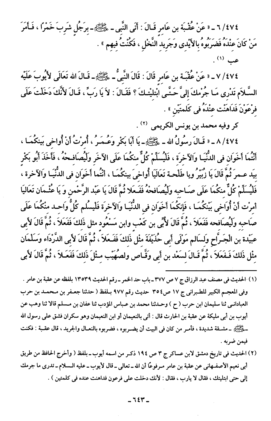 474/ 8 - "قَالَ رسُولُ الله - صلى الله عليه وسلم - يَا أَبَا بَكْر وَعُمَرُ، أُمِرْتُ أَنْ أُواخِى بَينكُمَا، أَنْتُمَا أَخَوَانِ في الدُّنْيَا وَالآخِرَة، فَليُسَلِّمْ كُلٌّ مِنكُمَا عَلَى الآخَرِ وَلْيُصَافِحْهُ، فَأَخَذَ أَبُو بَكْرٍ بِيَد عمرَ ثُمَّ قَالَ يَا زُبَيْرُ ويا طَلْحة تَعَالَيَا أُواخِىَ بينكُمَا، أنْتُما أَخَوَانِ في الدُّنْيَا وَالآخرة، فَلْيُسَلِّمْ كُلٌّ مِنكُمَا عَلَى صَاحِبِه وَلْيُصَافحْهُ فَفَعَلا ثُمَّ قَالَ يَا عَبْد الرَّحْمنِ وَيَا عُثمَان تَعَاليَا أمِرْت أَنْ أُوَاخِى بَيْنكُمَا، فَإنكُمَا أَخَوَانِ فِى الدُّنْيَا وَالآخِرَة فَلْيُسلم كُلُّ وَاحِد منْكُمَا عَلَى صَاحبِهِ وَلْيُصَافِحه فَفَعَلَا، ثُمَّ قَالَ لأُبِّي بن كَعْبٍ وابن مَسْعُودٍ مثل ذَلِكَ فَفَعَلَا، ثُمَّ قَالَ لأَبِى عبَيْدة بن الْجَرَّاحِ وَلِسَالم مَوْلَى أَبِى حُذَيْفَةَ مِثْل ذَلِكَ فَفَعَلَا، ثُمَّ قَالَ لأَبِى الدَّرْدَاء وَسَلْمَان مِثْل ذَلكَ فَفَعَلَا، ثُمَّ قَالَ لِسَعْد بن أَبِى وَقَّاص ولصُهَيْب مِثْلَ ذَلِكَ فَفَعَلَا، ثُمَّ قَالَ لأَبى