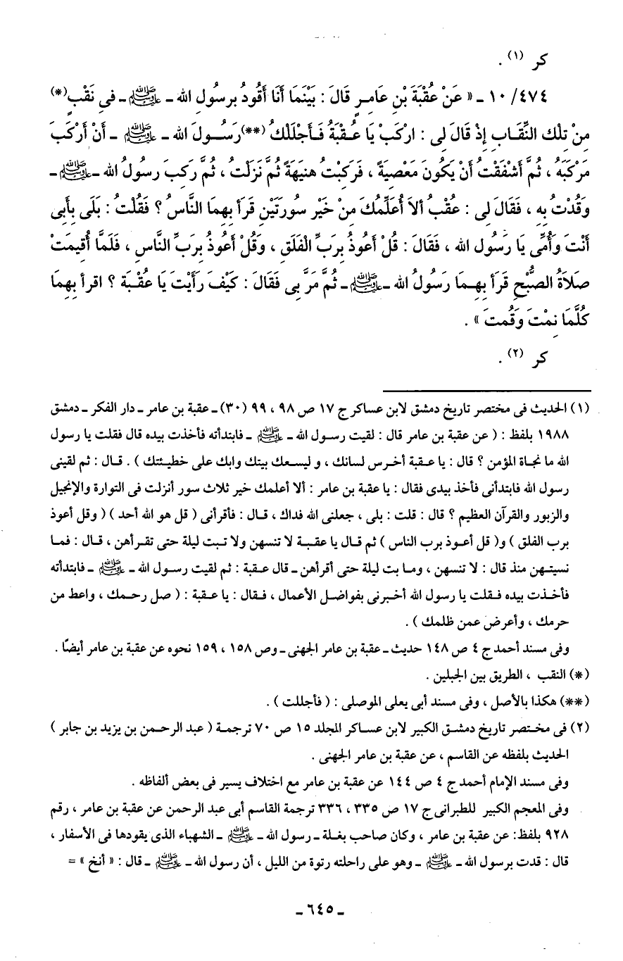 474/ 10 - "عَنْ عُقْبَةَ بْنِ عَامِرٍ قَالَ: بَيْنَمَا أنَا أَقُودُ برسُولِ الله - صلى الله عليه وسلم - فِى نَقْبٍ (*) مِنْ تِلْك النِّقَابِ إِذْ قَالَ لِى: ارْكَبْ يَا عُقْبَةُ فَأَجْلَلْكُ (* *) رَسُولَ الله - صلى الله عليه وسلم - أَنْ أَرْكَبَ مَرْكَبَهُ، ثُمَّ أَشْفَقْتُ أَنْ يَكُونَ مَعْصِيَةً، فَرَكِبْتُ هنَيهَةً ثُمَّ نَزَلْتُ، ثُمَّ رَكِبَ رسُولُ الله - صلى الله عليه وسلم - وَقُدْتُ بهِ، فَقَالَ لِى: عُقْبُ ألَا أُعَلِّمُكَ مِنْ خَيْر سُورَتَيْنِ قَرَأ بِهِمَا النَّاسُ؟ فَقُلْتُ: بَلَى بِأَبِى أَنْتَ وَأُمِّى يَا رَسُول الله، فَقَالَ: قُلْ أَعُوذُ بِرَبِّ الْفَلَقِ، وَقُلْ أَعُوذُ بِرَبِّ النَّاسِ، فَلَمَّا أُقِيمَتْ صَلَاةُ الصُّبْحِ قَرَأ بِهِمَا رَسُولُ الله - صلى الله عليه وسلم - ثُمَّ مَرَّ بِى فَقَالَ: كَيْفَ رَأَيْتَ يَا عُقْبَة؟ اقرأ بِهِمَا كُلَّمَا نِمْتَ وَقُمتَ".