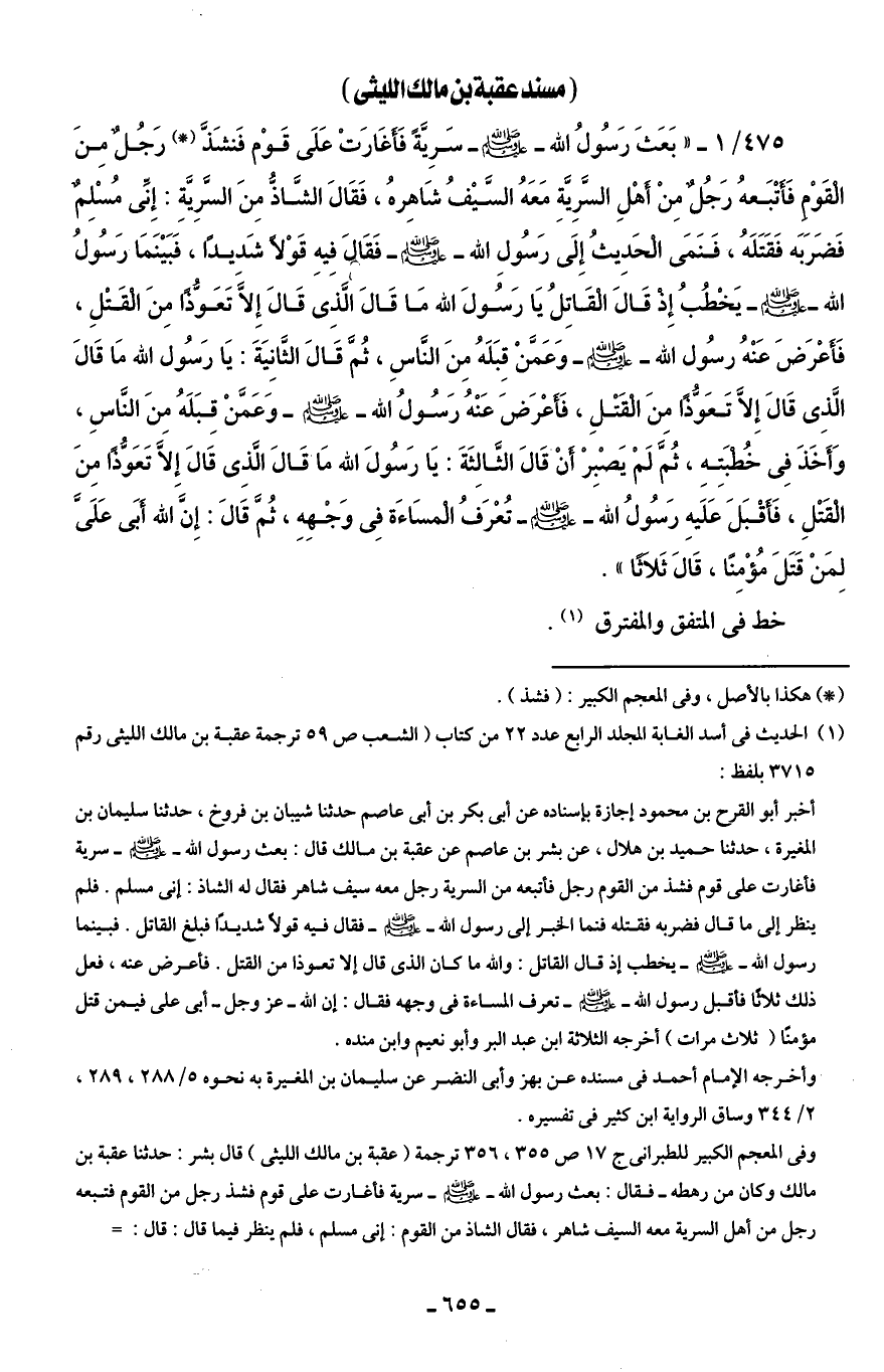 وفى المعجم الكبير للطبرانى ج 17 ص 355، 356 ترجمة (عقبة بن مالك الليثى) قال بشر: حدثنا عقبة بن مالك وكان من رهطه - فقال: بعث رسول الله - صلى الله عليه وسلم - سرية فأغارت على قوم فشذ رجل من القوم فتبعه رجل من أهل السرية معه السيف شاهر، فقال الشاذ من القوم: إنى مسلم، فلم ينظر فيما قال: قال: =