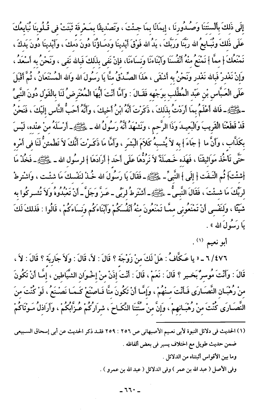إِلَى ذَلِكَ بِأَلْسِنَتِنَا وَصُدُورِنَا، إِيمَانًا بِمَا جِئْتَ، وَتَصْدِيقًا بِمَعْرِفَةٍ ثَبَتَتْ في قُلُوبِنَا نُبَايِعُكَ عَلَى ذَلِكَ ونُبَايعُ الله رَبَّنَا وَرَبَّكَ، يَدُ الله فَوْقَ أَيْدِينَا وَدِمَاؤُنَا دُونَ دَمِكَ، وَأَيْدِينَا دُونَ يَدِكَ، نَمْنَعُكَ [مِمَّا] نَمْنَعُ مِنْهُ أَنْفُسَنَا وَأبْنَاءَنَا وَنِسَاءَنَا، فإِنْ نَفِى بِذَلِكَ فَبِالله نَفِى، وَنَحْنُ بِهِ أَسْعَدُ، وَإنْ نَغْدِرْ فَبِالله نَغْدِر وَنَحْنُ بِهِ أَشْقَى، هَذَا الصِّدْقُ مِنَّا يَا رَسُولَ الله وَالله الْمُسْتَعَانُ، ثُمَّ أَقْبَلَ عَلَى الْعَبَّاسِ بْنِ عَبْدِ الْمُطَّلِبِ بِوَجْهِهِ فَقَالَ: وَأَمَّا أَنْتَ أَيُّهَا الْمُعْتَرِضُ لَنَا بِالْقَوْلِ دُونَ النَّبِىِّ - صلى الله عليه وسلم - فَالله أَعْلَمُ بِمَا أَرَدْتُ بِذَلِكَ، ذَكَرْتَ أنَّهُ ابْنُ أَخِيكَ، وَأَنَّهُ أَحَبُّ النَّاس إِلَيْكَ، فَنَحْنُ قَدْ قَطَعْنَا الْقَرِيبَ وَالْبَعِيدَ وَذَا الرَّحِمِ، وَنَشْهَدُ أَنَّهُ رَسُولُ الله - صلى الله عليه وسلم - أَرْسَلَهُ مِنْ عِنْدِهِ، لَيْسَ بِكَذَّابٍ، وَأَنَّ ما [جَاءَ] بِهِ لَا يُشبهُ كَلَامَ الْبَشَرِ، وَأَمَّا مَا ذَكَرْتَ أَنَّكَ لَا تَطْمئنُّ لَنَا فِى أَمْرِهِ حَتَّى تَأخُذ مَوَاثِيقَنَا، فَهَذِهِ خَصَلَةٌ لَا نَرُدُّهَا عَلَى أَحَدٍ [أَرَادَهَا] لرسُولِ الله - صلى الله عليه وسلم - فَخُذْ مَا [شِئْتَ] ثُم الْتَفَت [إِلَى] النَّبِىِّ - صلى الله عليه وسلم - فَقَالَ يَا رَسُولَ الله خُذْ لِنَفْسِكَ مَا شِئْت، وَاشْترطْ لِرَبَّكَ مَا شِئْتَ، فَقَالَ النَّبِىُّ - صلى الله عليه وسلم - أَشْتَرطُ لِرَبَّى - عَزَّ وَجَلَّ - أَنْ تَعْبُدُوهُ وَلَا تُشركُوا بِه شَيْئًا، وَلِنَفْسِى أَنْ تَمْنَعُونِى مِمَّا تَمْنَعُونَ مِنْهُ أَنْفُسَكُمْ وَأَبْنَاءَكُم وَنِسَاءَكُمْ، قَالُوا: فَذلكَ لَكَ يَا رَسُولَ الله".