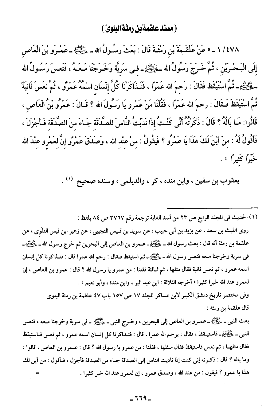 478/ 1 - " عَنْ عَلْقَمَةَ بْنِ رَمْثَةَ قَالَ: بَعَثَ رسُولُ الله - صلى الله عليه وسلم - عَمْرَو بْنَ الْعَاصِ إِلَى الْبَحْرَيْنِ، ثُمَّ خَرجَ رَسُولُ الله - صلى الله عليه وسلم - فِى سَرِيَّة وَخَرَجْنَا مَعَهُ، فَنَعسَ رَسُولُ الله - صلى الله عليه وسلم - ثُمَّ اسْتَيْقَظ فَقَالَ: رَحِمَ الله عَمْرًا، فَتَذَاكَرْنَا كُلَّ إِنْسَانٍ اسْمُهُ عَمْرٌو، ثُمَّ نعَسَ ثَانِيَةً ثُمَّ اسْتَيْقَظَ فَقَالَ: رحمَ الله عَمْرًا، فَقُلْنَا مَنْ عَمْرو يَا رَسُولَ الله؟ قَالَ: عَمْرُو بْنُ الْعَاصِ، قَالُوا: مَا بَالُهُ؟ قَالَ: ذَكَرْتُهُ أَنّى كنْتُ إِذَا نَدَبْتُ النَّاسَ للصَّدَقَةِ جَاءَ مِنَ الصَّدَقَةِ فَأَجْزَلَ، فَأَقُولُ لَهُ: مِنْ أيْنَ لَكَ هَذَا يَا عَمْرُو؟ فَيقُولُ: مِنْ عِنْدِ الله، وَصَدَقَ عَمْرو إِنَّ لِعَمْرٍو عِنْدَ الله خَيْرًا كَثِيرًا".