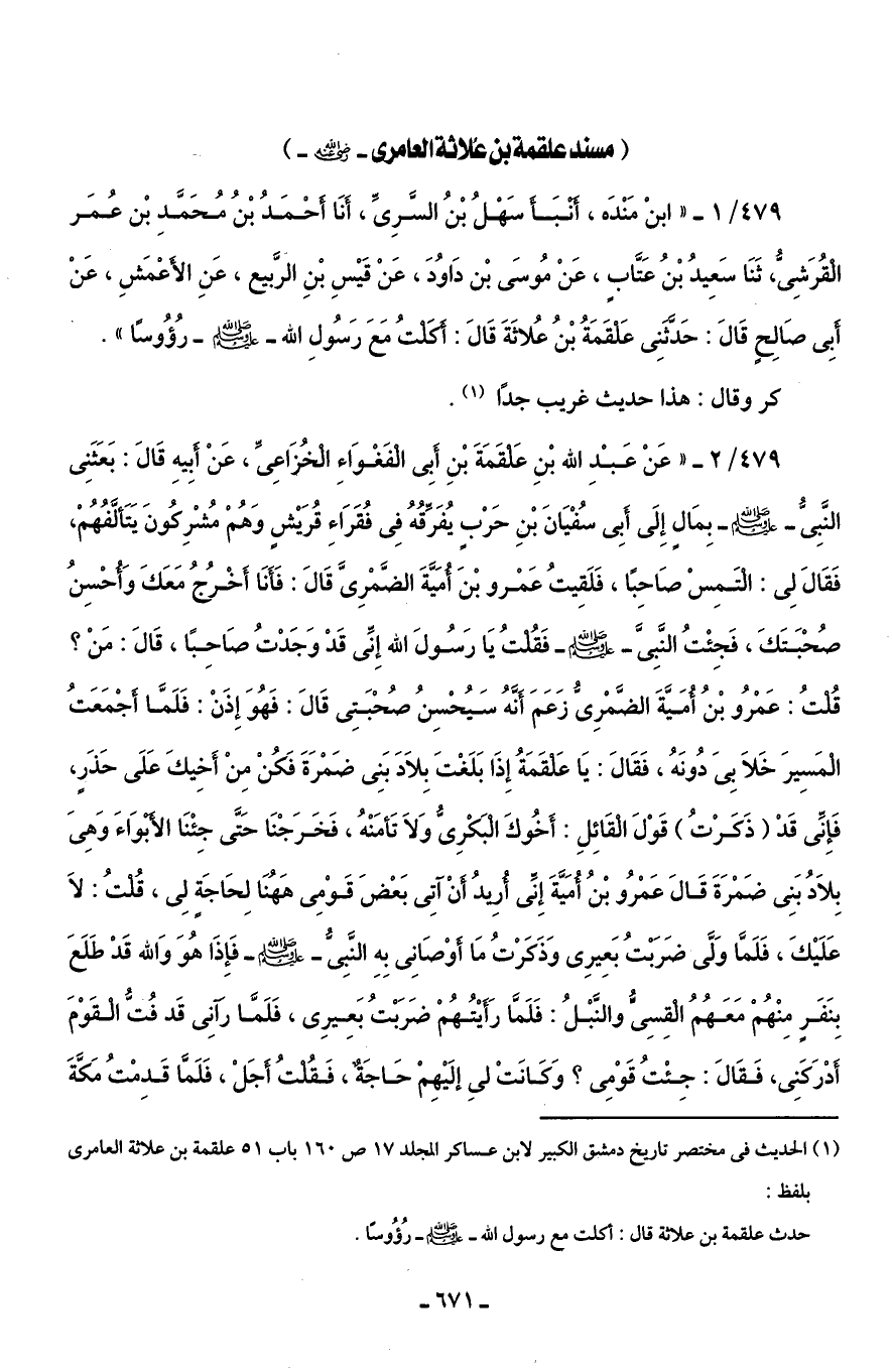 479/ 2 - "عَنْ عَبْدِ الله بْنِ عَلْقَمَةَ بْنِ أبِى الْفَغْوَاءِ الْخُزَاعِىِّ، عَنْ أَبِيهِ قَالَ: بَعَثَنِى النَّبِىُّ - صلى الله عليه وسلم - بِمَالٍ إِلَى أَبِى سُفْيَانَ بْنِ حَرْبٍ يُفَرِّقُهُ في فُقَرَاءِ قُرَيْشٍ وَهُمْ مُشْرِكُونَ يَتَألَّفُهُمْ، فَقَالَ لِى: الْتَمِسْ صَاحِبًا، فَلَقِيتُ عَمْرو بْنَ أُمَيَّةَ الضَّمْرِىَّ قَالَ: فَأَنَا أَخْرُجُ مَعَكَ وَأُحْسِنُ صُحْبَتَكَ، فَجِئْتُ النَّبىَّ - صلى الله عليه وسلم - فَقُلْتُ يَا رَسُولَ الله إِنِّى قَدْ وَجَدْتُ صَاحِبًا، قَالَ: مَنْ؟ قُلْتُ: عَمْرُو بْنُ أُمَيَّةَ الضَّمْرِىُّ زَعَمَ أنَّهُ سَيُحْسِنُ صُحْبَتِى قَالَ: فَهُوَ إِذَنْ: فَلَمَّا أَجْمَعَتُ الْمَسِيرَ خَلَا بِىَ دُونَهُ، فَقَالَ: يَا عَلْقَمَةُ إِذَا بَلَغْتَ بِلَادَ بَنِى ضَمْرَةَ فَكُنْ مِنْ أَخِيكَ عَلَى حَذَرٍ، فَإِنِّى قَدْ (ذَكَرْتُ) قَوْلَ الْقَائِلِ: أخُوكَ الْبَكْرِىُّ وَلَا تَأمَنْهُ، فَخَرَجْنَا حَتَّى جِئْنَا الأَبْوَاءَ وَهِىَ بِلَادُ بَنِى ضَمْرَةَ قَالَ عَمْرُو بْنُ أُمَيَّةَ إِنِّى أُرِيدُ أَنْ آتِى بَعْضَ قَوْمِى هَهُنَا لِحَاجَةٍ لِى، قُلْتُ: لَا عَلَيْكَ، فَلَمَّا وَلَّى ضَرَبْتُ بَعِيرِى وَذَكَرْتُ مَا أَوْصَانِى بِهِ النَّبِىُّ - صلى الله عليه وسلم - فَإِذَا هُوَ وَالله قَدْ طَلَعَ بِنَفَرٍ مِنْهُمْ مَعَهُمُ الْقِسِىُّ والنَّبْلُ: فَلَمَّا رَأيْتُهُمْ ضَرَبْتُ بَعِيرِى، فَلَمَّا رآنِى قَد فُتُّ الْقَوْمَ أَدْرَكَنِى، فَقَالَ: جِئْتُ قَوْمِى؟ وَكَانَتْ لِى إلَيْهِمْ حَاجَةٌ، فَقُلْتُ أَجَلْ، فَلَمَّا قَدِمْتُ مَكَّةَ